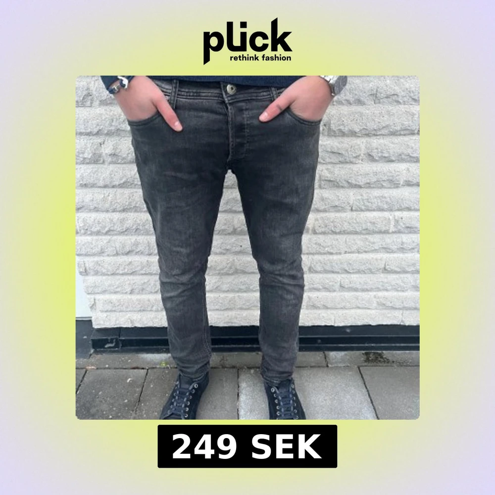 Snygga svarta jeansbyxor med en tight passform. De har en klassisk femficksdesign och en knappgylf. Perfekta för en stilren look. Modellen är 185 70 kg
