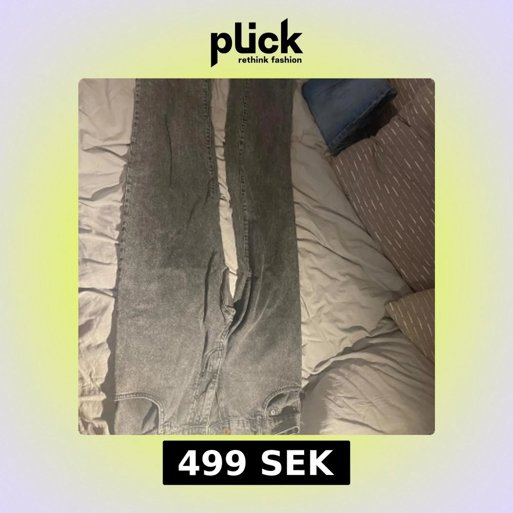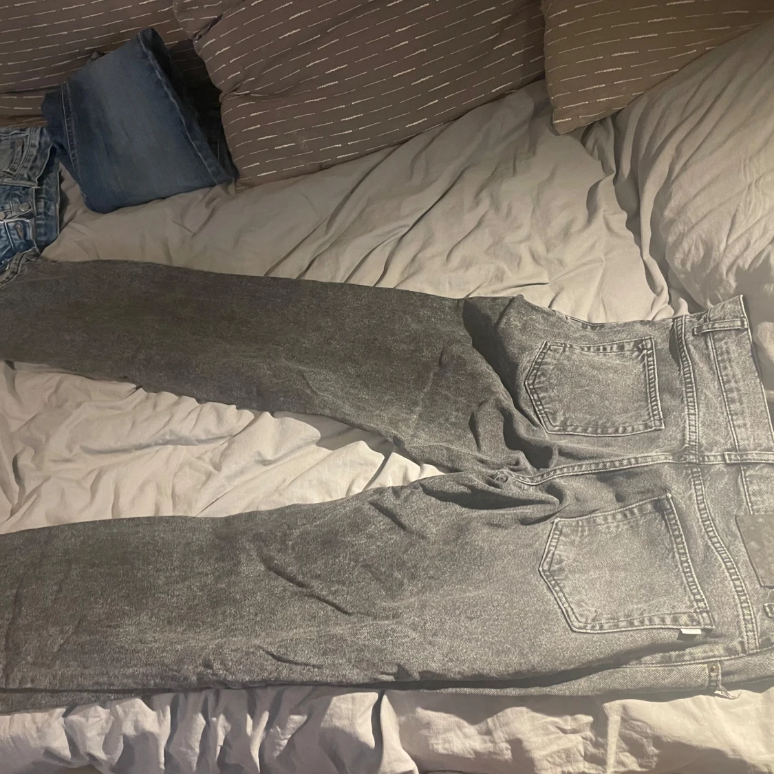 Säljer ett par gråa jeans med hög midja och raka ben. Jeansen har klassisk femficksdesign och dragkedja framtill. Perfekta för dig som gillar en avslappnad och tidlös look. Passar till allt och är superenkla att styla. 32 W 32 L