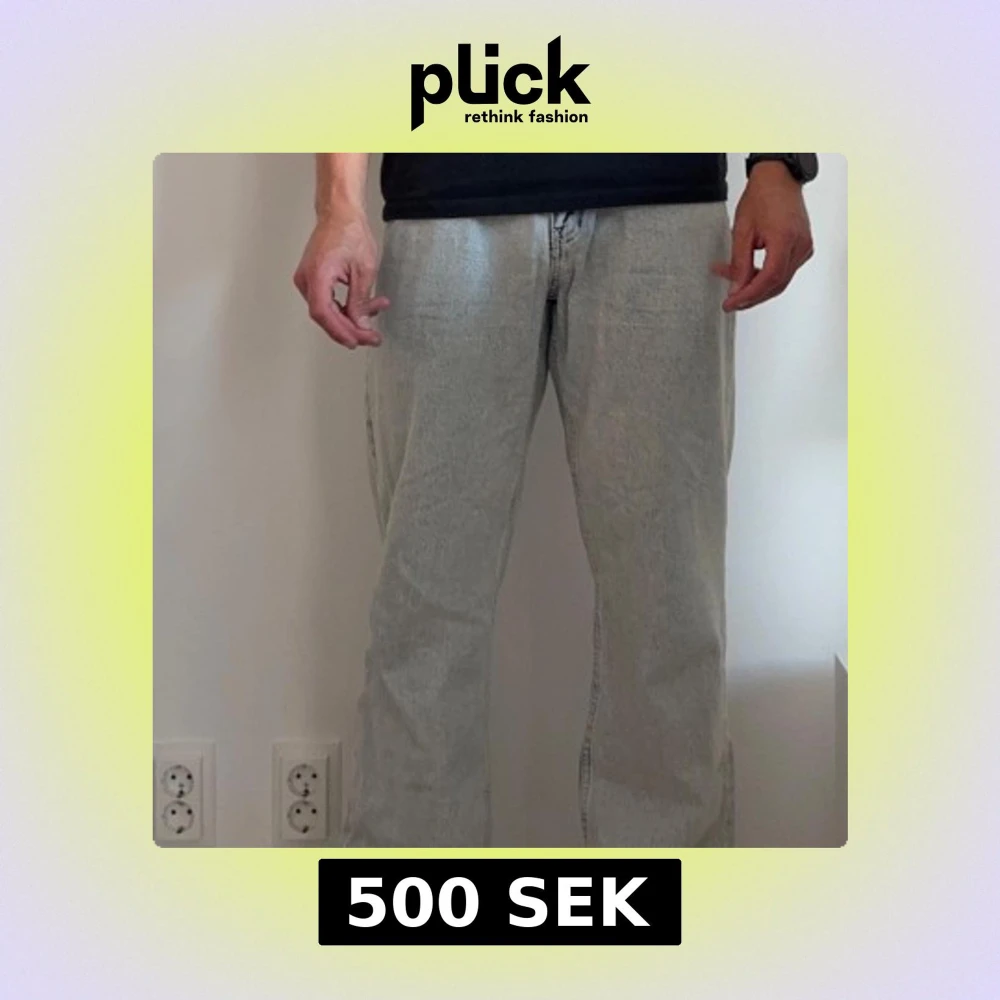 Säljer ett par ljusgråa jeans från Woodbird med relaxed fit och breda ben. Jeansen har klassisk femficksdesign, läderpatch bak och är tillverkade i bomull. Perfekta för dig som gillar en loose och avslappnad stil.