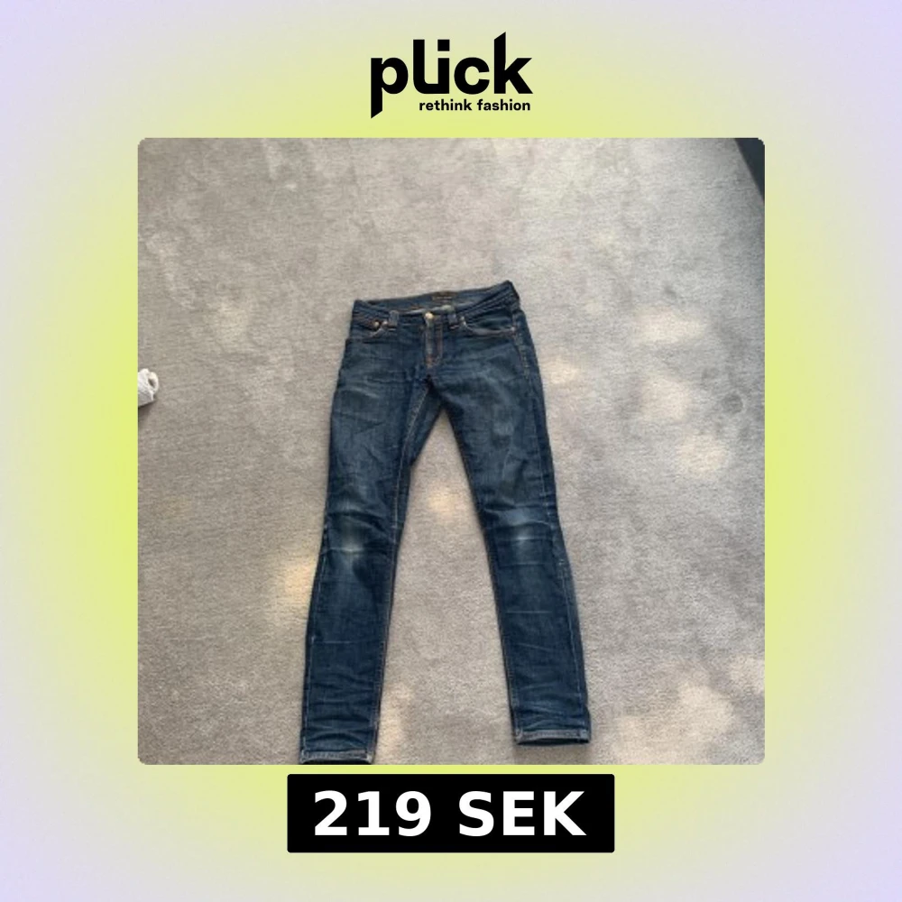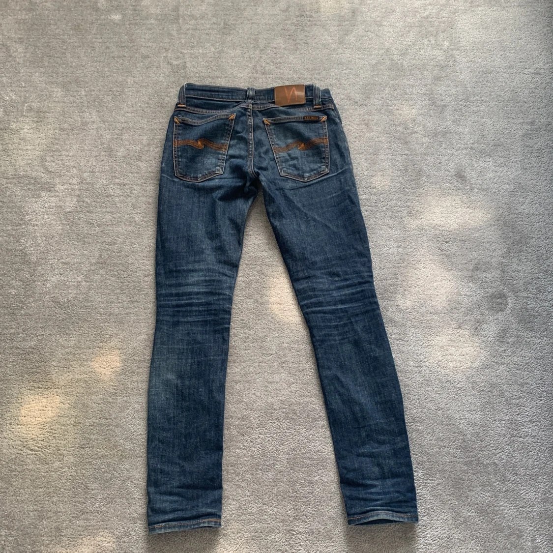 Säljer ett par mörkblå jeans från Nudie Jeans med klassisk femficksdesign och orangea sömmar. Byxorna har smal passform och raka ben, perfekt för en stilren vardagslook.