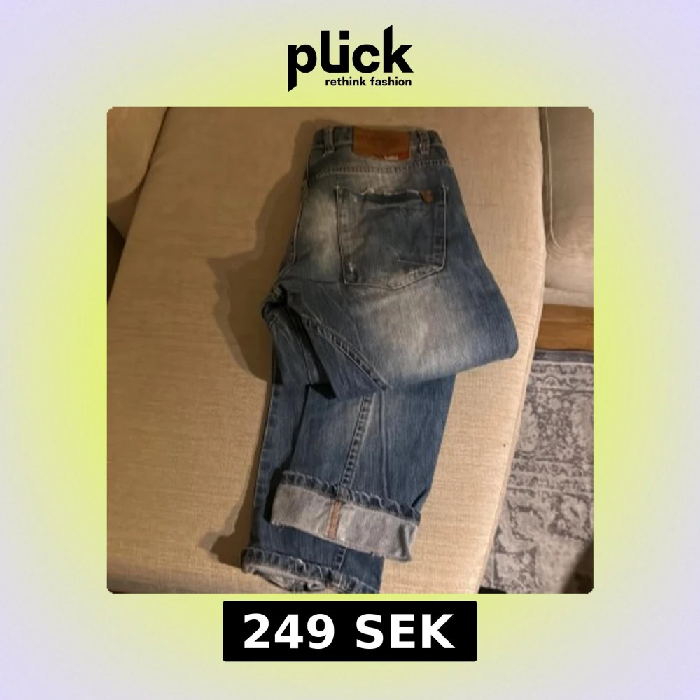Säljer ett par coola blå jeans från Saliglias7 med slitningar och distressed detaljer på både fram- och baksida. Jeansen har klassisk femficksdesign, läderpatch med logga och en tvättad look som ger dem en avslappnad vibe. Perfekt för dig som gillar streetstyle.