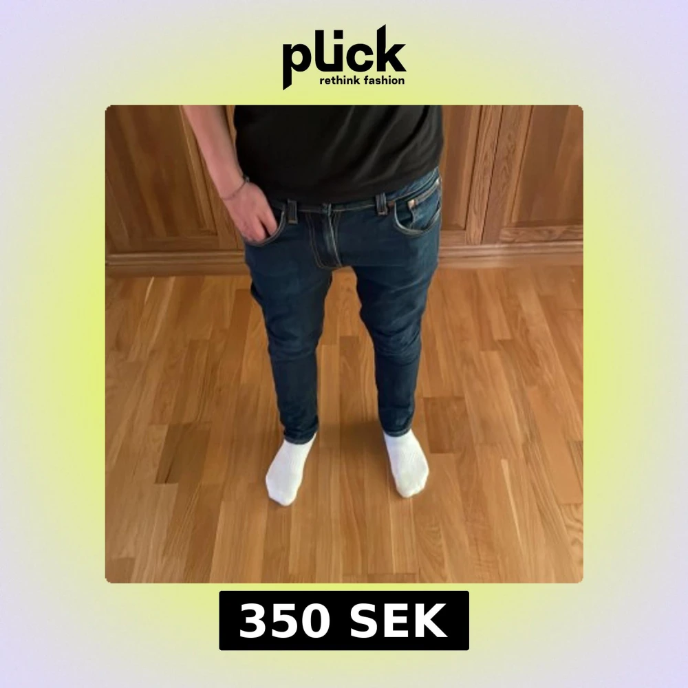 Säljer ett par mörkblå jeans från Nudie Jeans Co med klassiska orange sömmar och snygg broderad bakficka. Jeansen har en slim passform och raka ben, tillverkade i bomull. Perfekta för dig som gillar stilrena och tidlösa jeans.