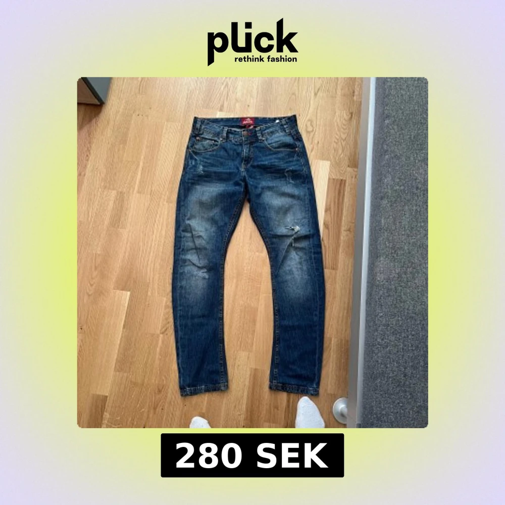 Säljer ett par blå jeans med snygga slitningar och en liten reva på ena benet. Klassisk femficksmodell med raka ben och normal passform. Perfekta för en avslappnad stil.