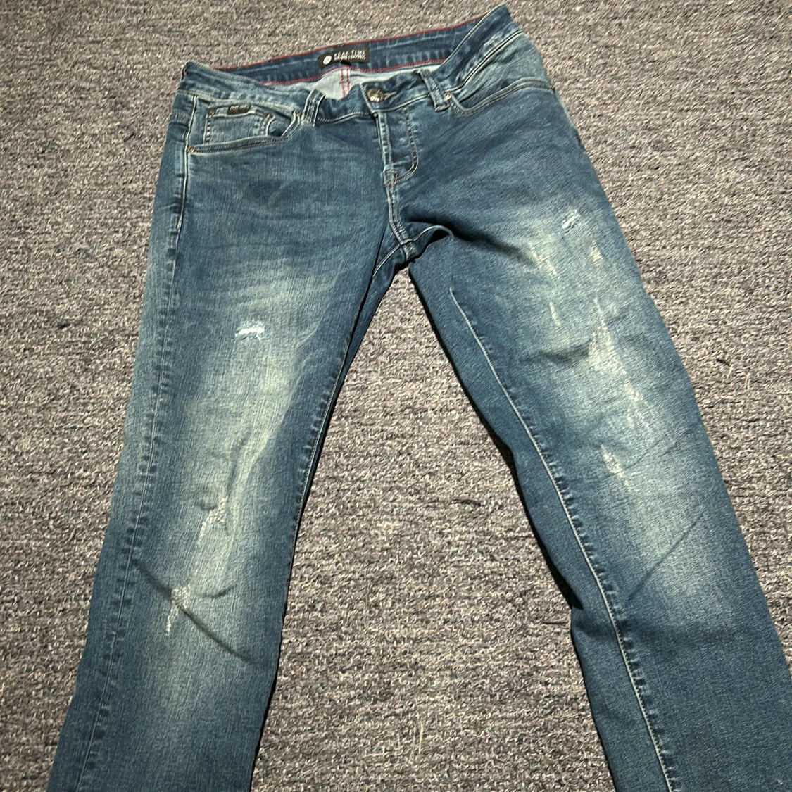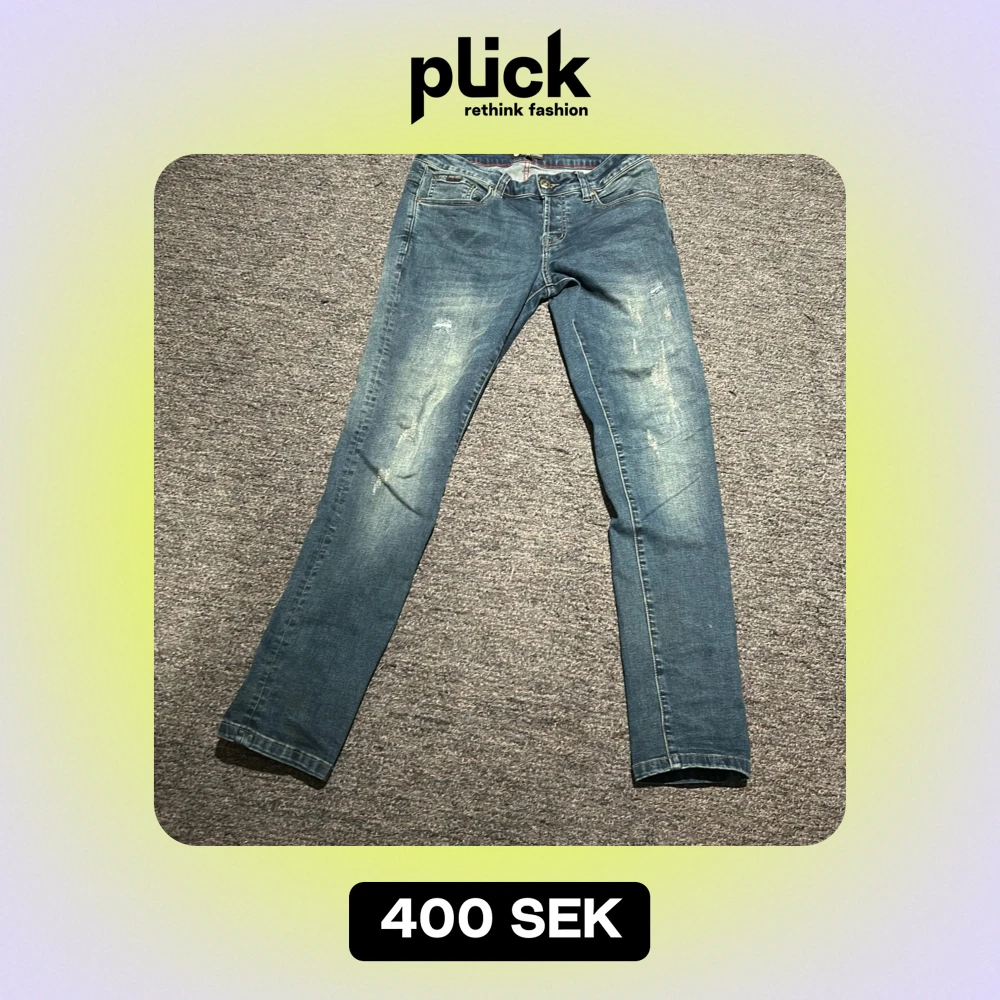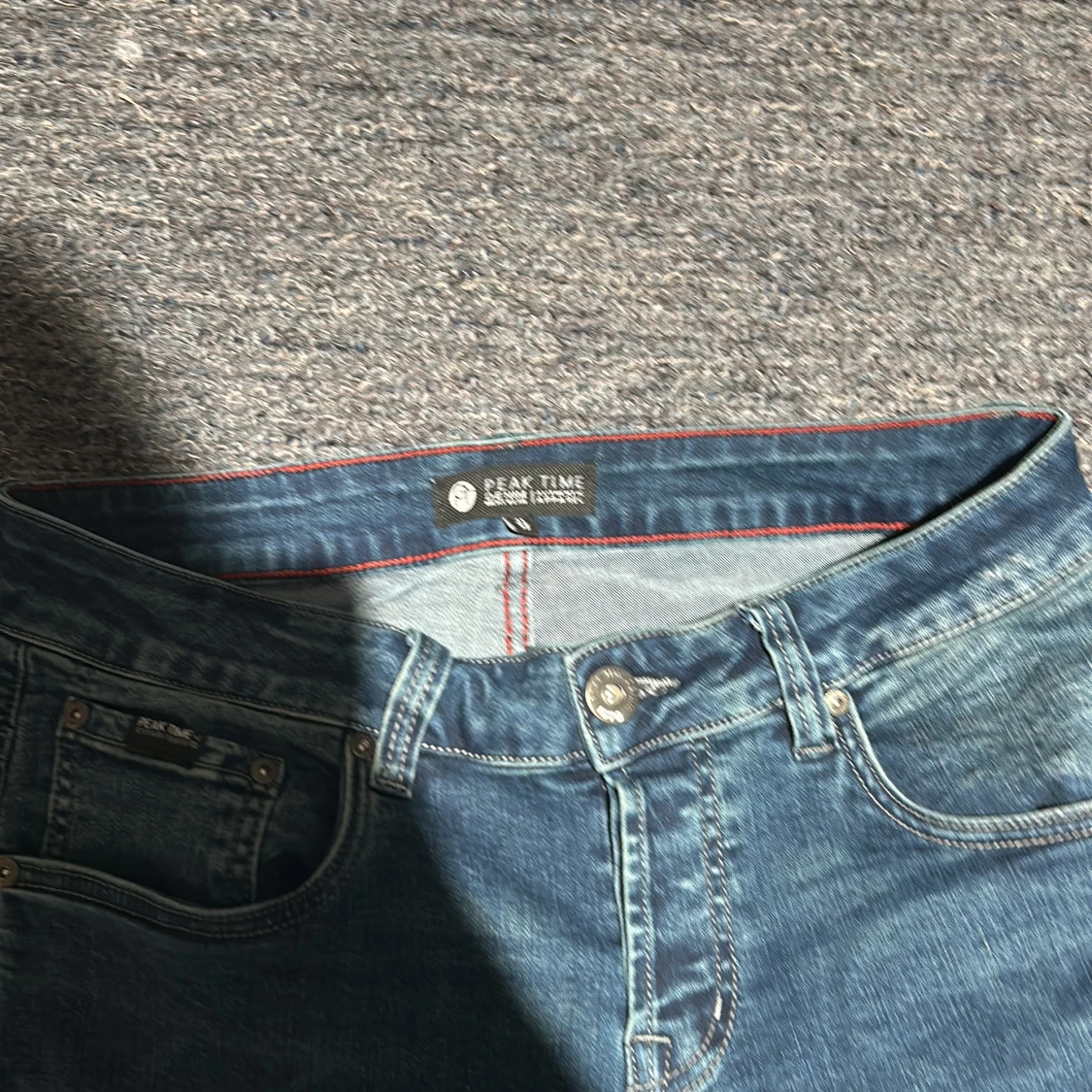 Säljer ett par snygga blå jeans från Black Time i storlek W31 L32. De har en klassisk straight fit och är i bra skick med lite slitningar för en cool look. Perfekta för både vardag och fest!