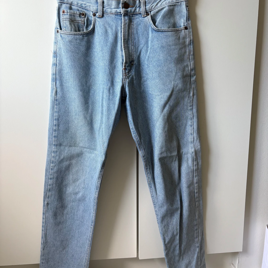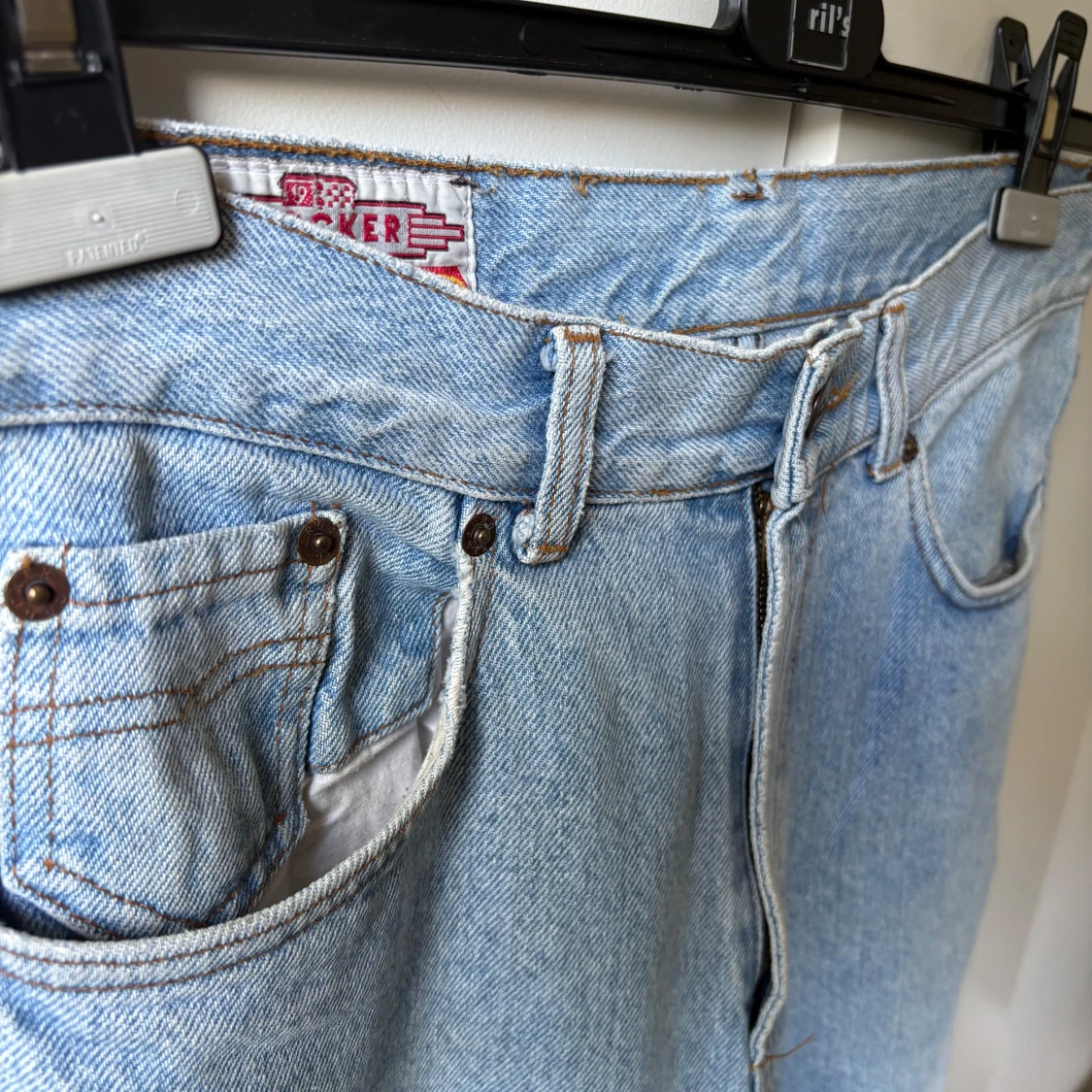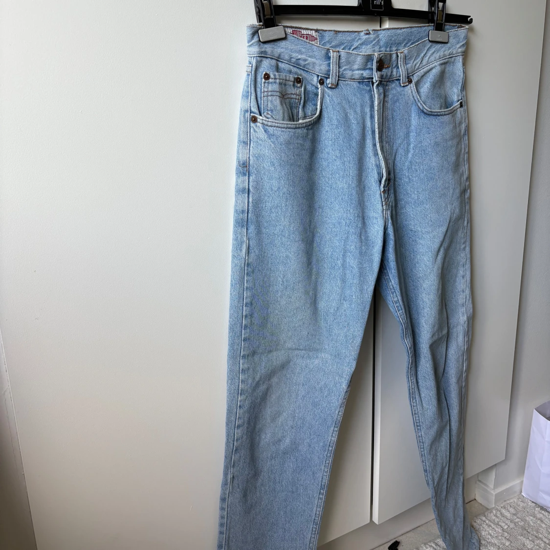 Storleken är Waist 32 Längd 34 Ljusblå jeans från Crocker med klassisk femficksdesign och raka ben. Jeansen har normalhög midja.