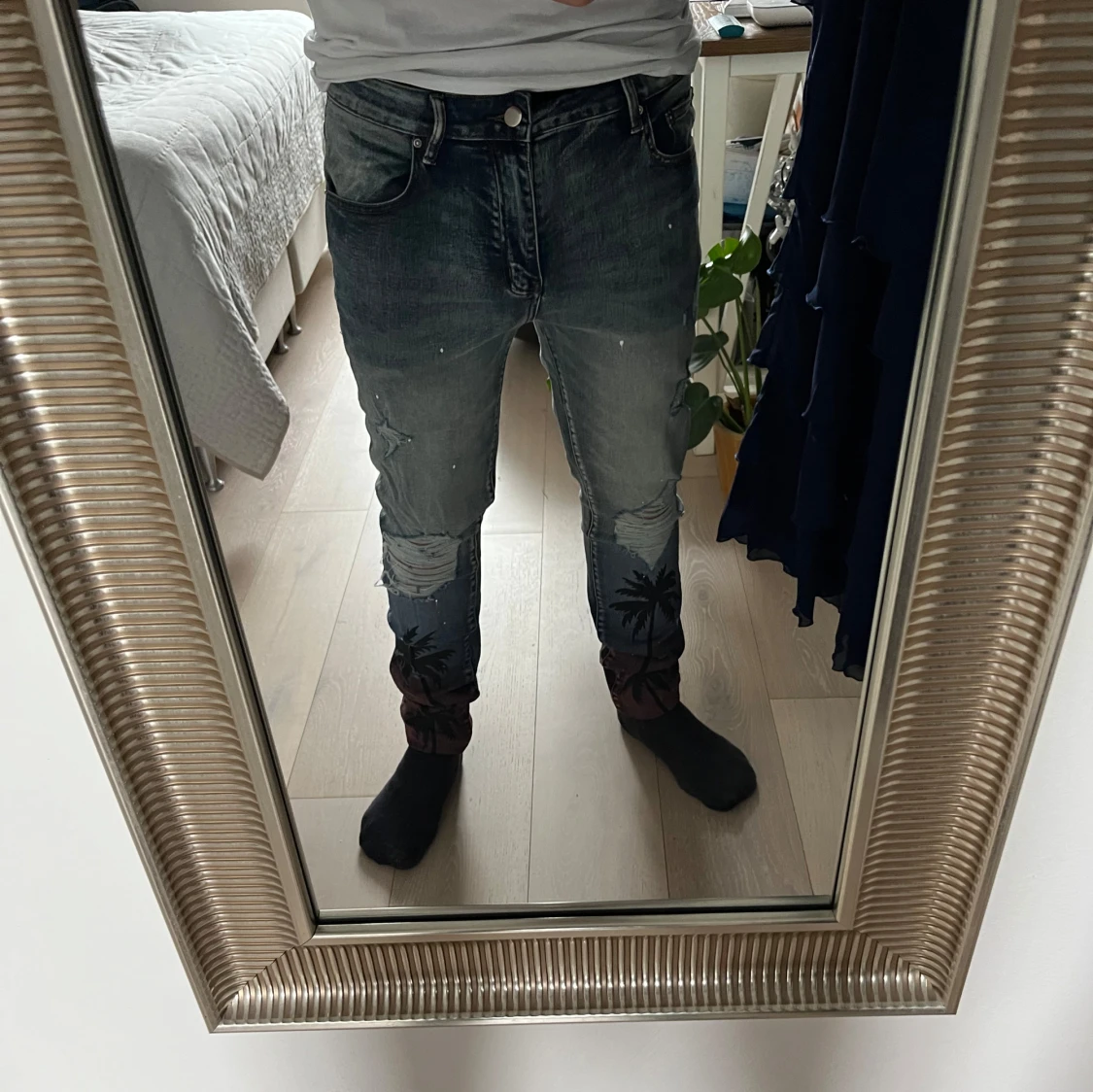 Unika blå jeans med coolt palmtryck på nedre delen av benen. Klassisk femficksmodell med normal passform och knappar i gylfen. Perfekta för dig som vill sticka ut lite extra.