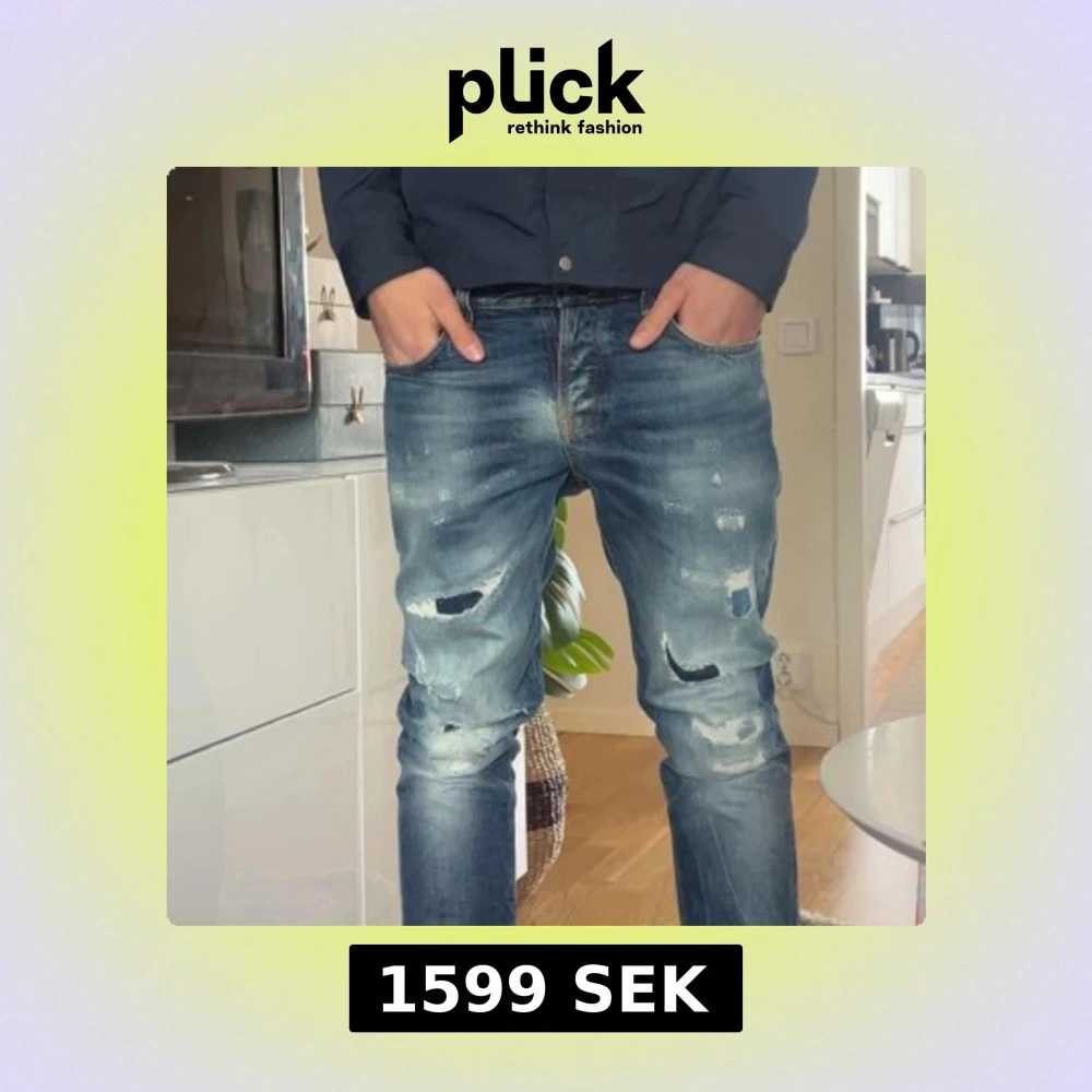 Säljer ett par blå jeansbyxor från Nudie Jeans med slitningar och hål på framsidan. Byxorna har raka/slim ben, orangea sömmar. Perfekta för en avslappnad och trendig look. Nypris ca 2500kr