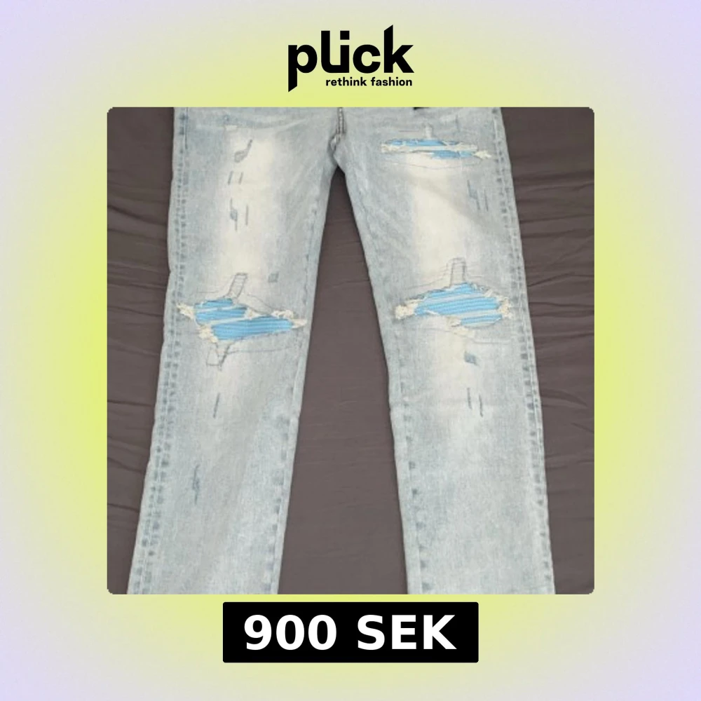 Ljusblå jeans från Amiri med tydliga slitningar och blå lappar under de trasiga partierna på benen. Klassisk femficksmodell med raka ben och snygga detaljer som ger en cool streetkänsla.