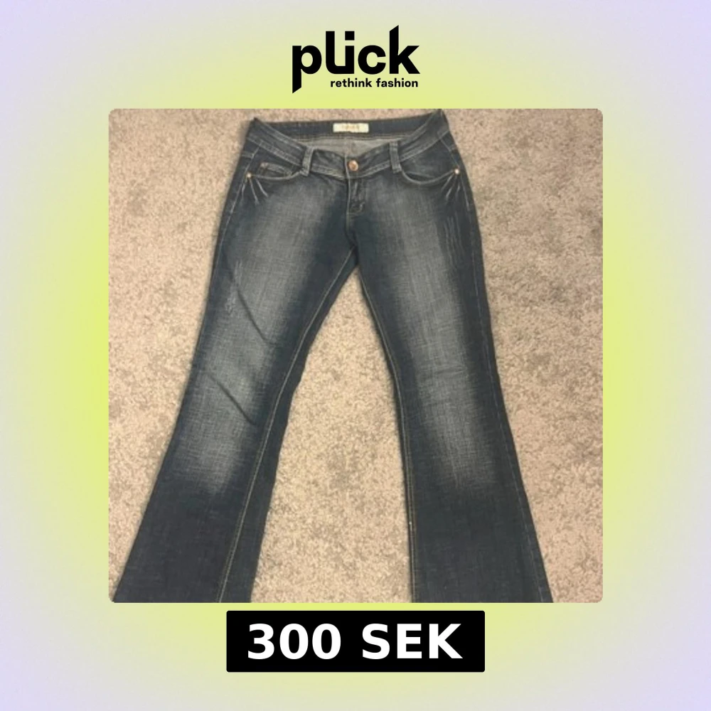 Snygga lågmidjade mörkblå bootcut jeans med coola dekorationer på bakfickorna. De har en klassisk femficksdesign och en knappgylf. Perfekta för en avslappnad stil med en touch av bling. Aldrig andvönt köpt begagnat säljer då dom är för stora storlek 33 en knapp saknas bak
