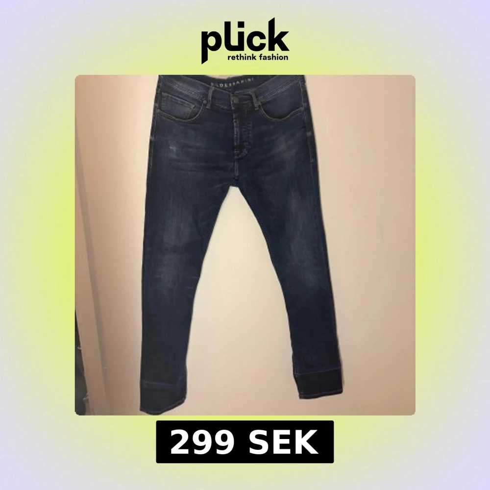 Snygga mörkblå jeans från Baldessarini med en klassisk femficksdesign. De har en knappgylf och är tillverkade i ett slitstarkt denimtyg. Perfekta för en stilren look. Inga defekter bra skick passar 175-185 centimeter