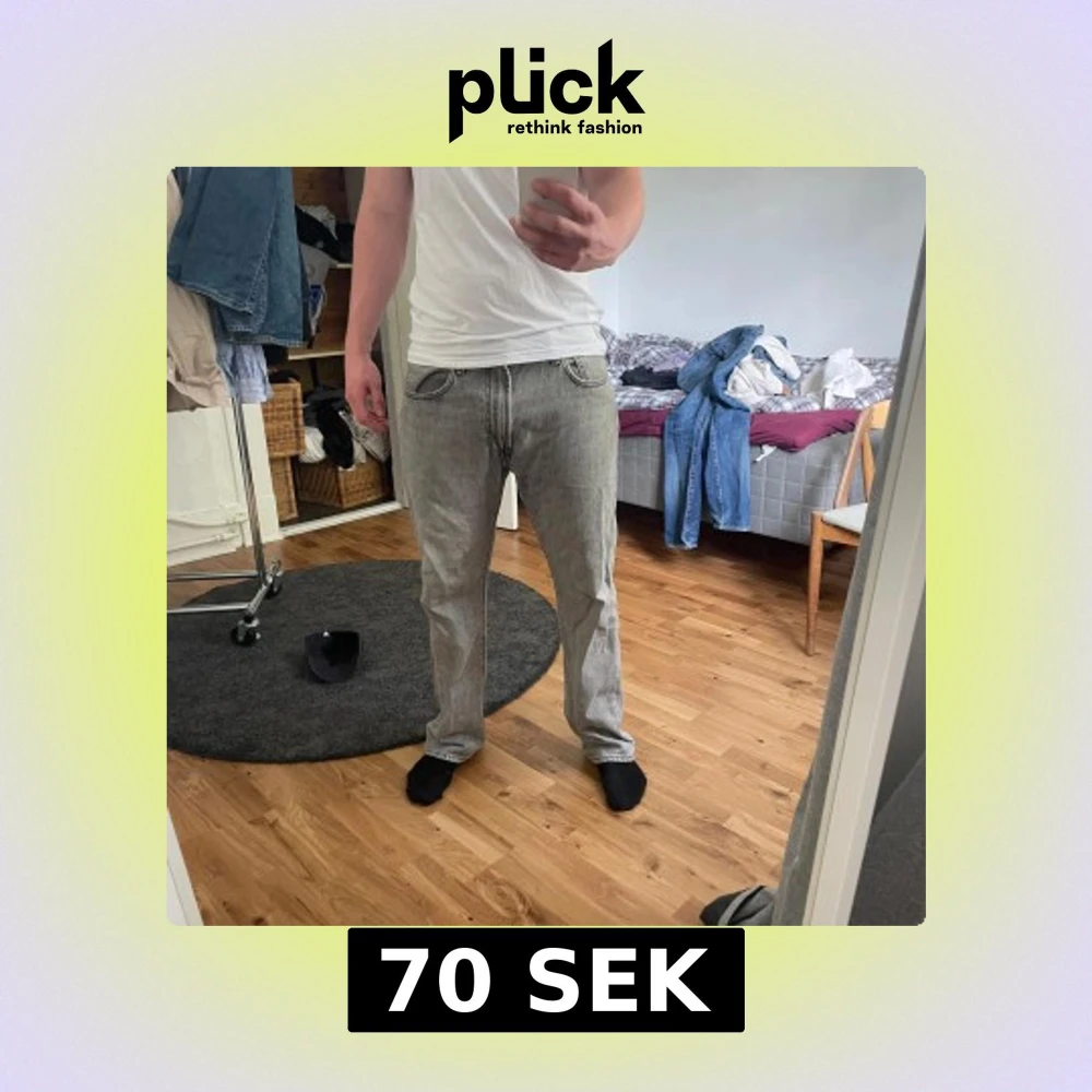 Säljer ett par grå jeans med raka ben och snygga kontrastsömmar. Klassisk femficksmodell och normal passform, perfekta för en avslappnad stil. Jeansen har en ljusgrå tvätt och är tillverkade i bomullsdenim.