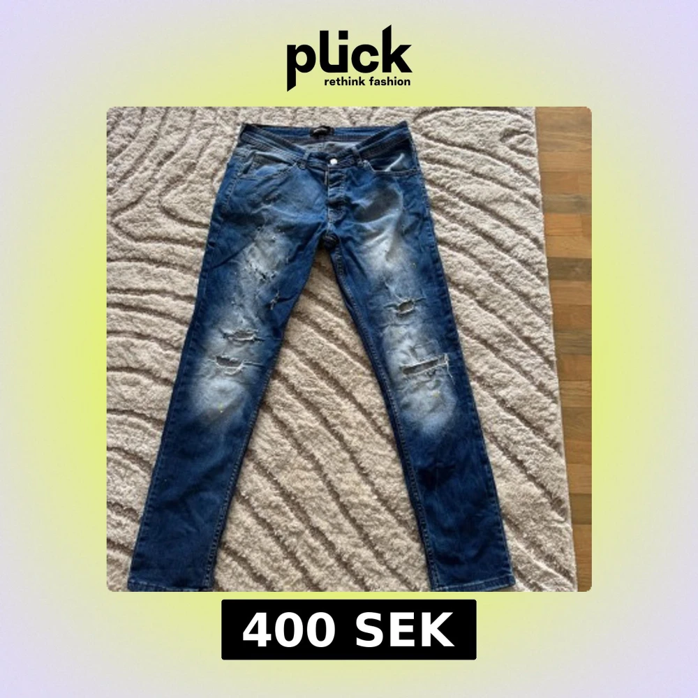 Säljer ett par blå jeans från Dsquared2 ICON med slitna detaljer och ljusa partier framtill. Byxorna har normal passform, klassisk femficksdesign och knappgylf. En defekt där stygnen håller på att gå upp på ICON märket. Storlek 34/34
