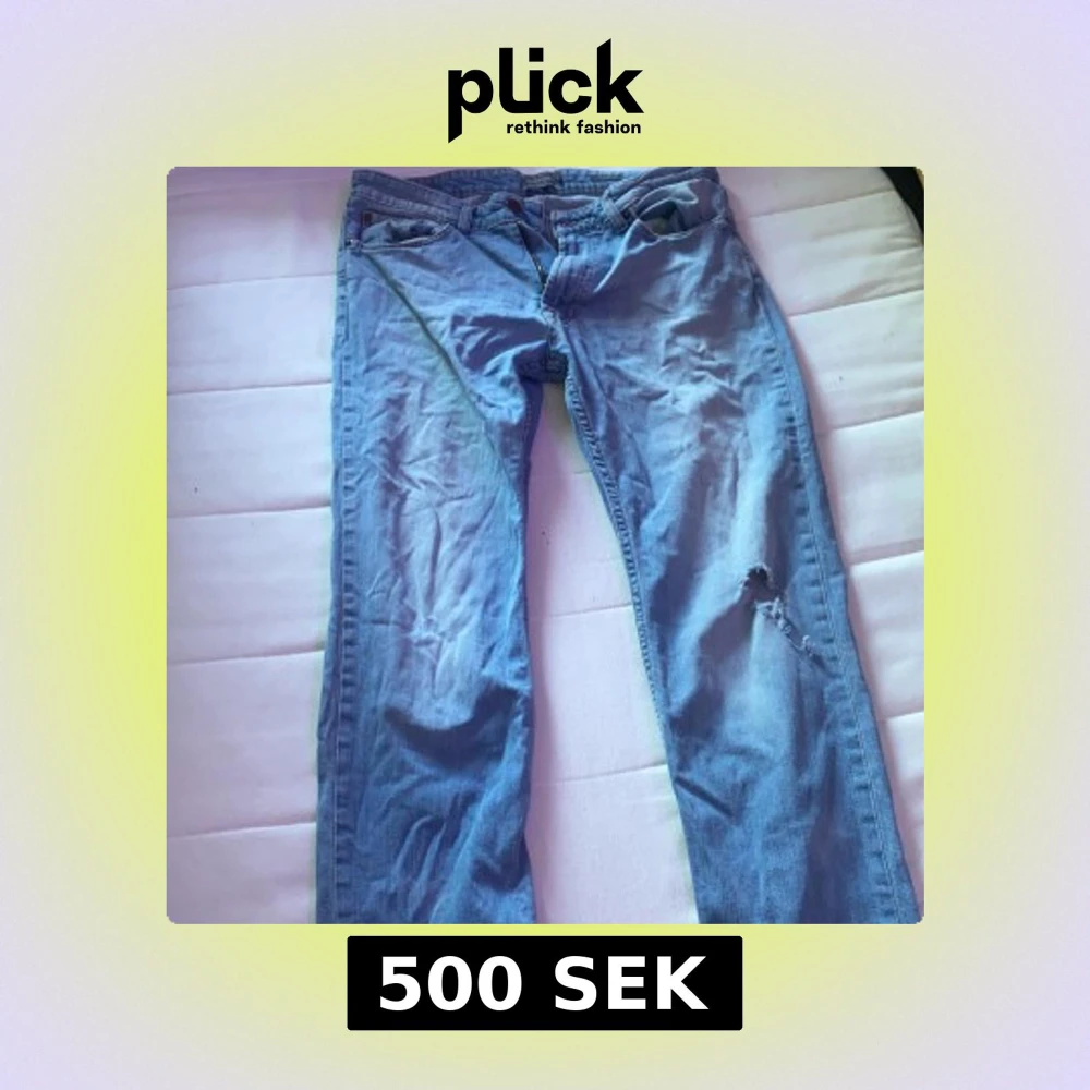 Säljer ett par klassiska blå jeans med snygg slitning på ena benet. Jeansen har fem fickor, normal passform och raka ben. Perfekta för en avslappnad streetstil och tillverkade i mjukt jeanstyg.