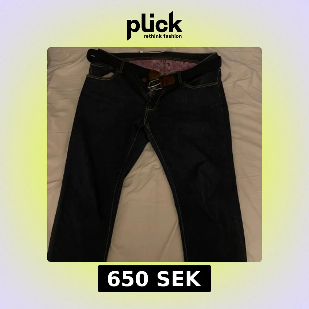 Snygga mörkblå jeans från Oscar Jacobson med en unik rosa mönstrad insida. Byxorna har en klassisk design med knappar och bälte. Perfekta för en stilren look. Byxorna är i storlek 34 men små i storleken så skulle nog säga att dem är i 30-31. Längden på dem är L30.