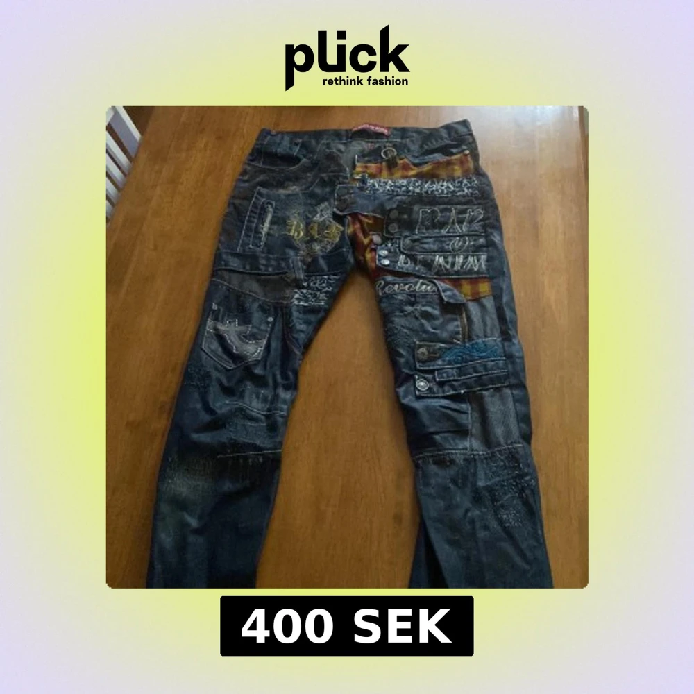 Unika jeans från BAR Magic of Denim i storlek 34/34. Mörkblå denim med patchwork, broderier, tryck och paljettdetaljer. Flera fickor, knappar och coola kontrastsömmar. Perfekta för dig som vill sticka ut med en kreativ streetstyle.