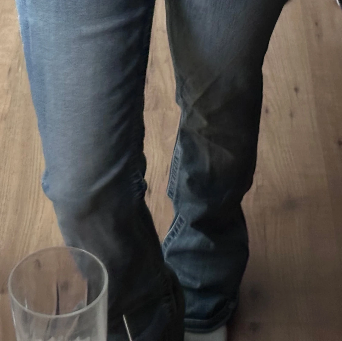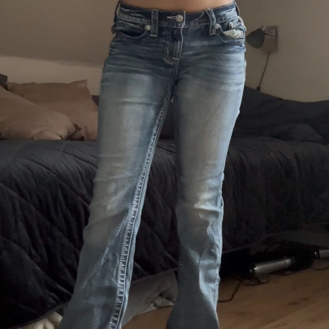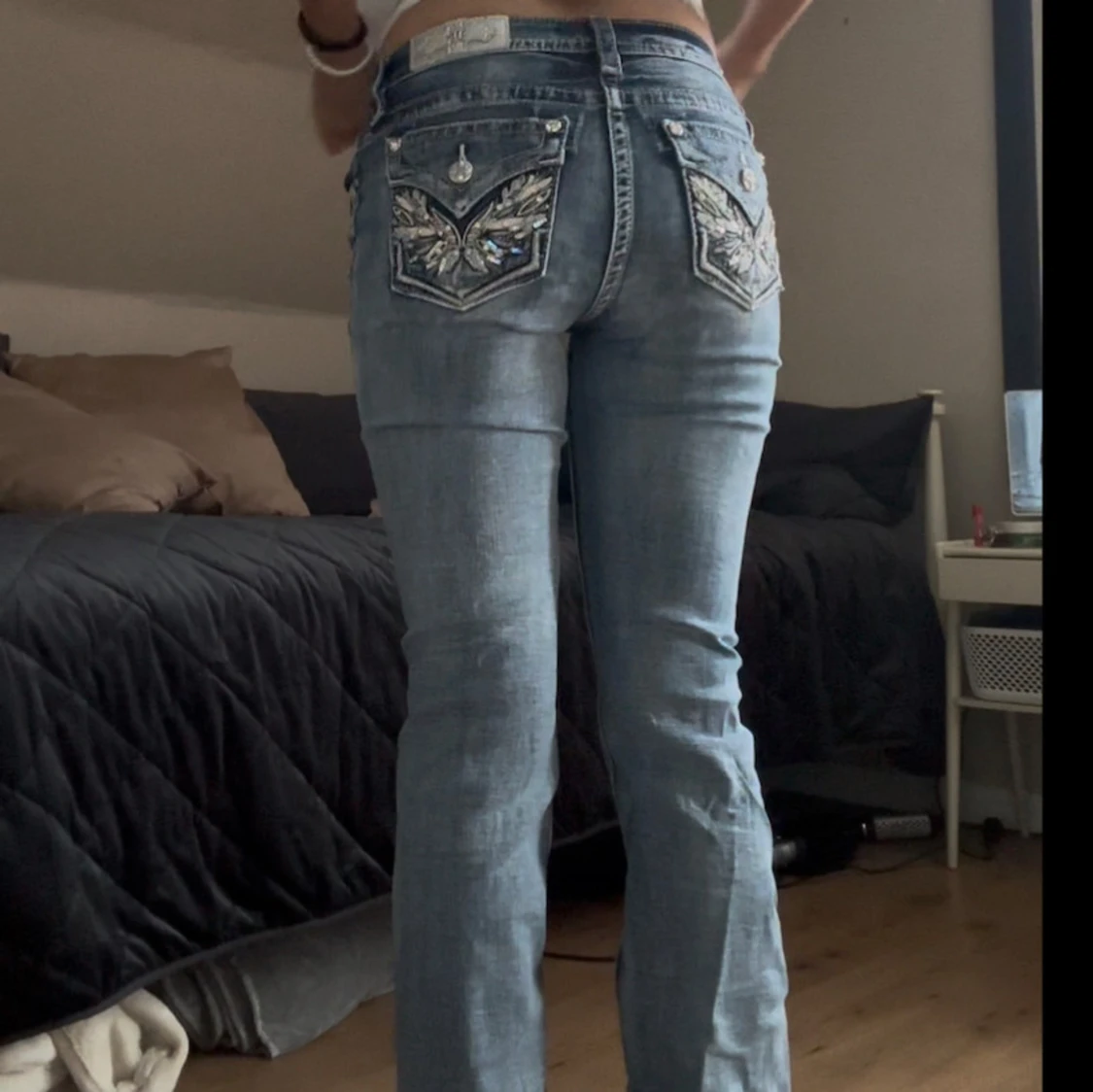 Snygga blå bootcut jeans med låg midja och broderade detaljer på bakfickorna. Innerbensmåttet är 82 cm.