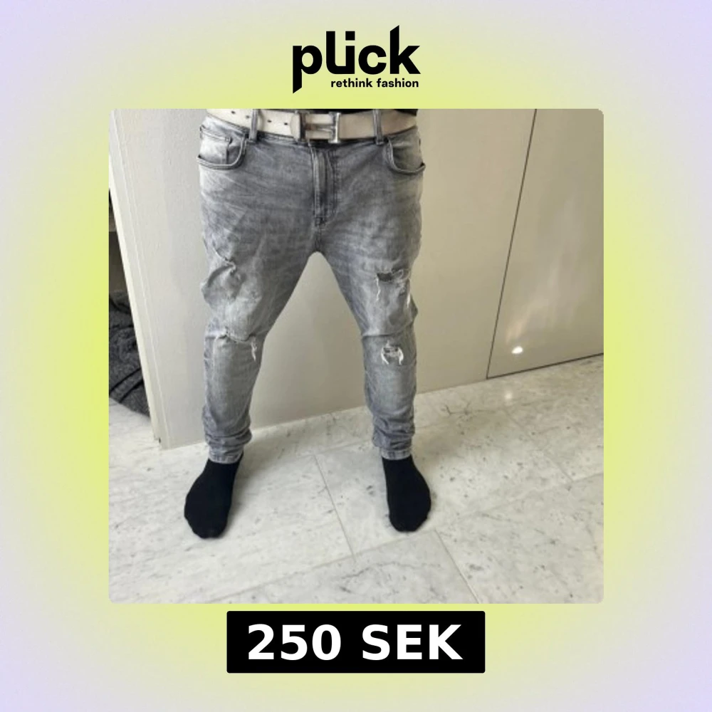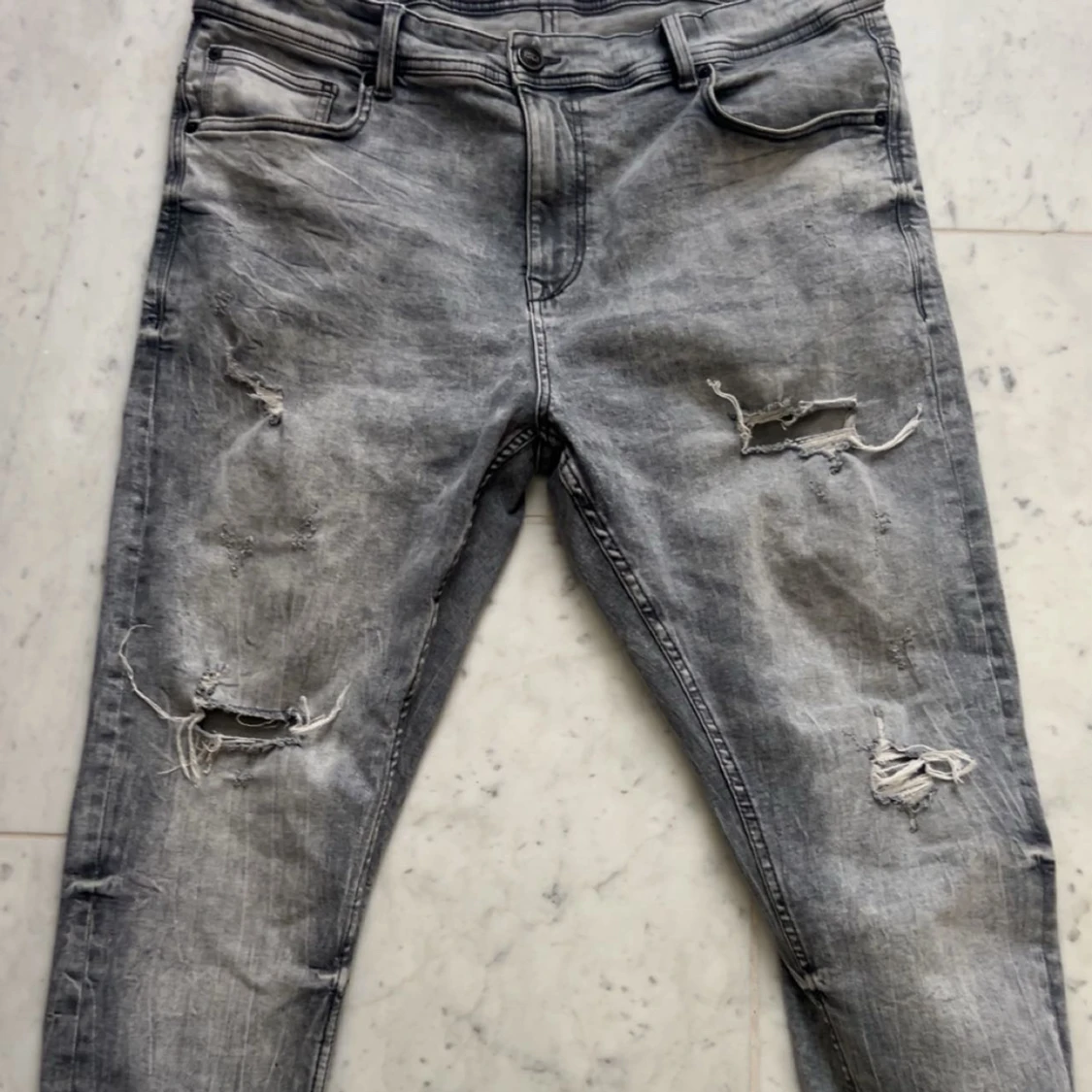 Säljer ett par grå jeans med slitningar och hål på både fram- och baksida. Jeansen har en tapered passform och normal midja. De är tillverkade i denim och har en cool, streetig vibe med sina trasiga detaljer.