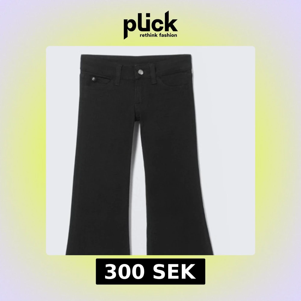 Svarta jeans med flare-ben och lowwaist, byxorna är från weekday och har ett litet hål i låret ingenting som syns när man har på sig dom, endast andvänd en gång. kan gå ner o pris eller byta mot samma storlek i modellen booty bei