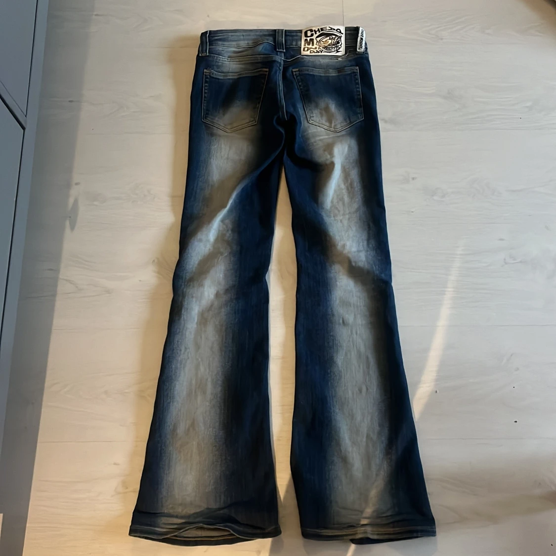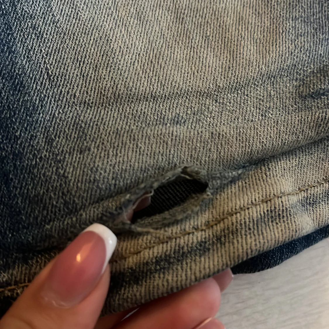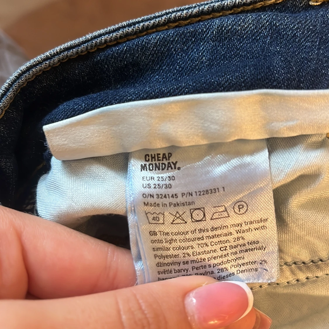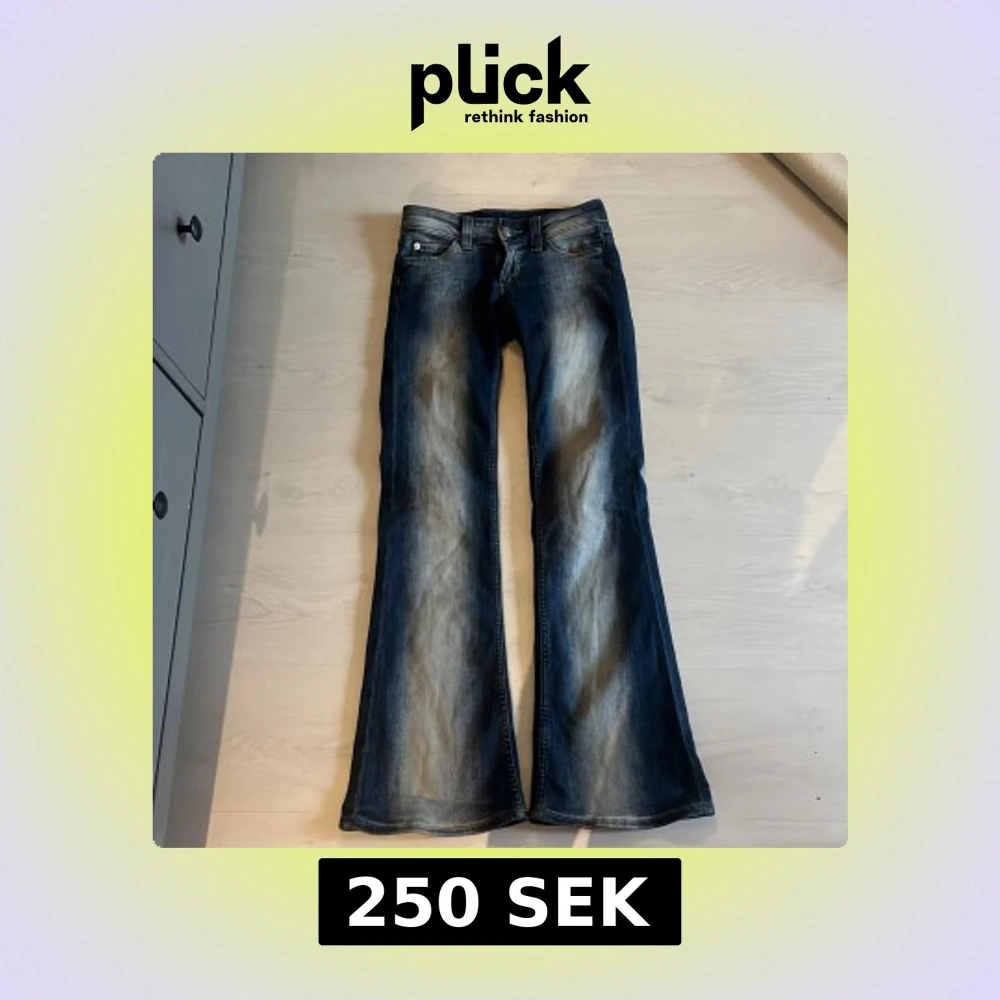 Snygga blå bootcut jeans från weekday i storlek 25/30. Jeansen har en klassisk femficksmodell, slitna detaljer och ljusare tvätt längs benen. Materialet är 70% bomull, 28% polyester och 2% elastan för lite stretch. de är lite slitna nere men det var för att de var för små för mig så jag trampade lite på dem det är ett litet hål längst ner vid sömnen.