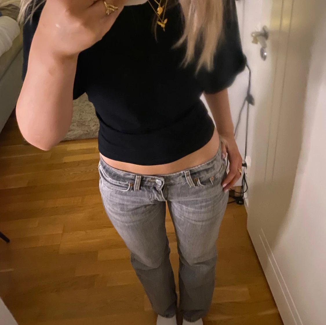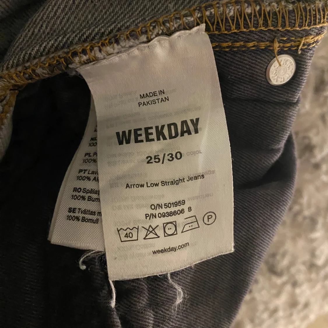 Säljer ett par gråa Weekday jeans i modellen Arrow Low Straight. De har en låg midja och en rak passform som ger en avslappnad look. Perfekta för en casual stil.