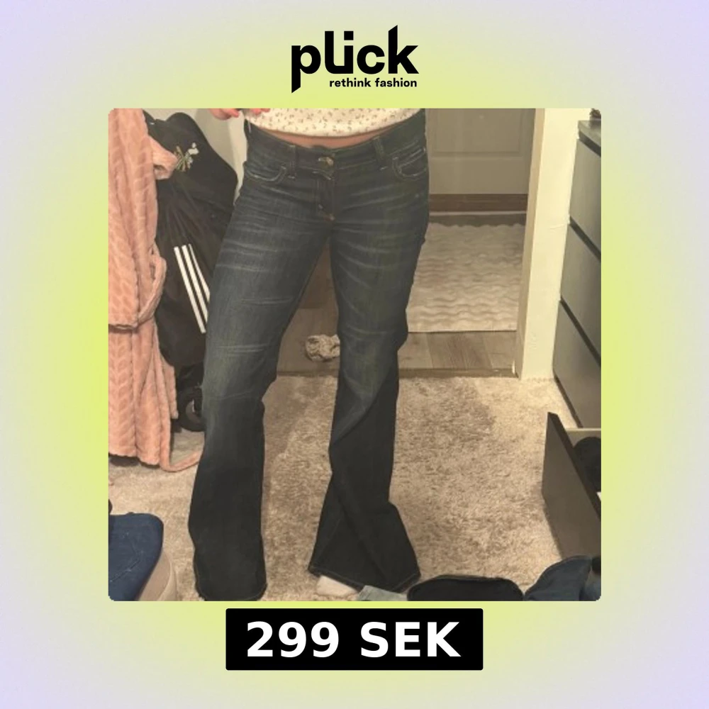 Säljer ett par mörkblå bootcut jeans från weekday med snygga slitningar och kontrastsömmar. Jeansen har låg midja och en rosa broderad logga bak i linningen. Klassisk femficksmodell i stretchigt denimtyg som sitter riktigt snyggt.