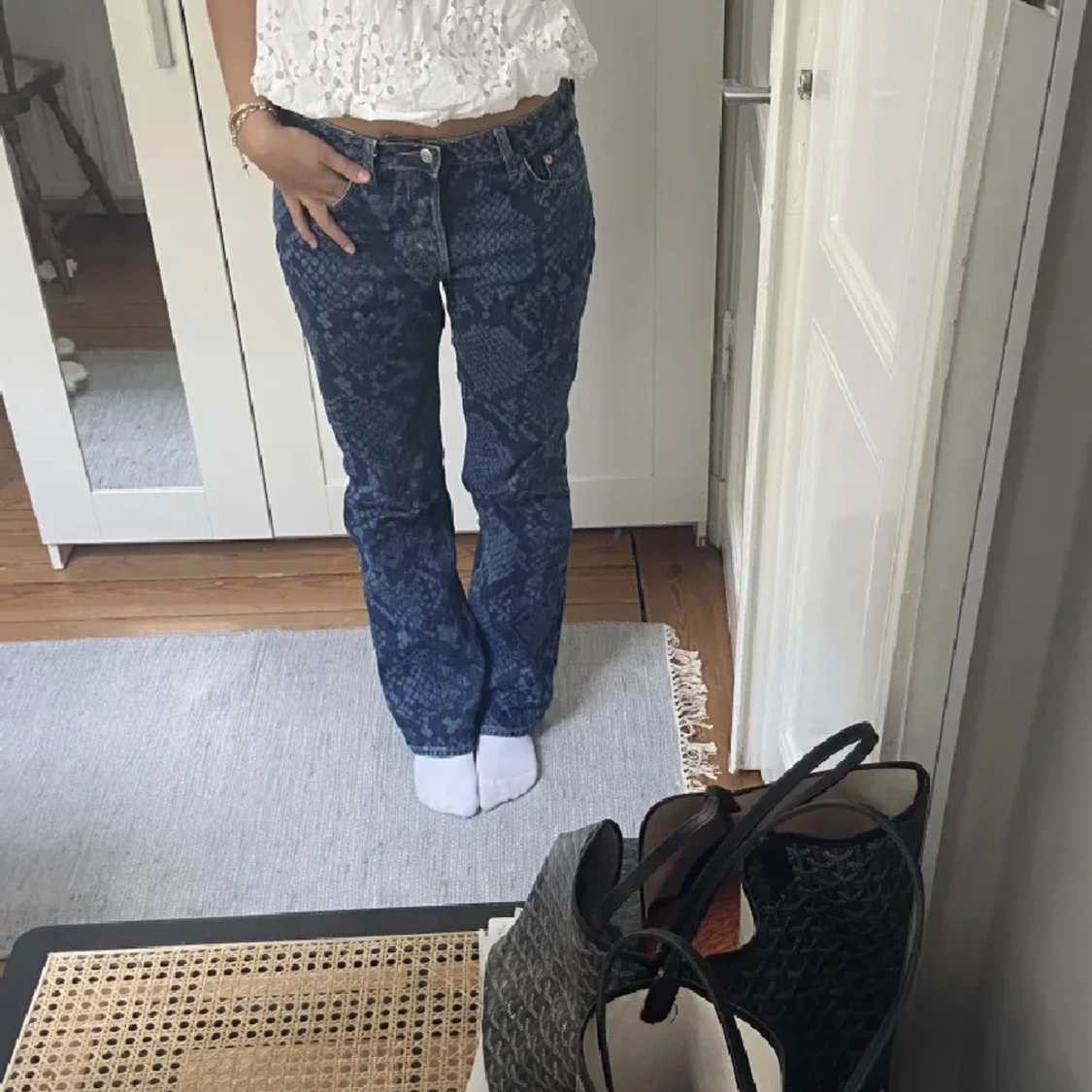Jättesnygga jeans med ormmönster, från weekday! Passar storlek 34-36 typ! Aldrig använda utan bara testade