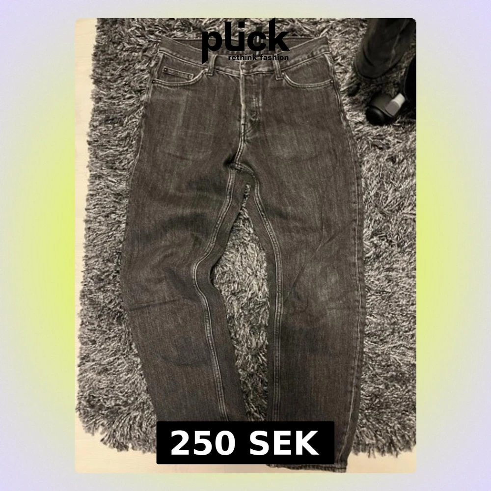 Säljer ett par grå Barrel jeans från Weekday i storlek 27/30. De har en loose passform med raka ben och klassisk femficksdesign. Jeansen är tillverkade i denim med tydliga sömmar och har en cool, lite tvättad look.