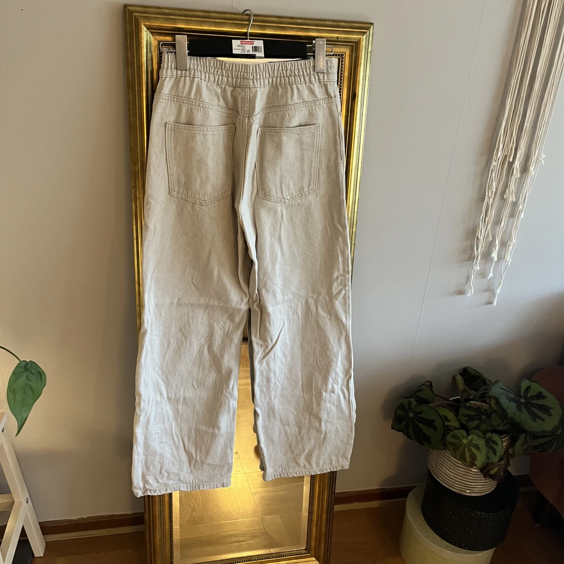 Cremefärgade stretchiga jeans med vida ben. De är halvhöga i midjan. Använda då ggr så i jättefint skick.