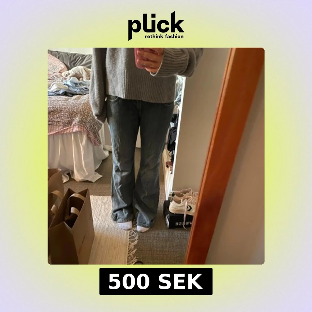 Säljer ett par klassiska blå jeans från weekday med bootcut passform. Jeansen är använda men inget super märkbart förutom små slitningar längst nere. Osäker på storlek men aningen 28/32 eller 29/32 💕💕