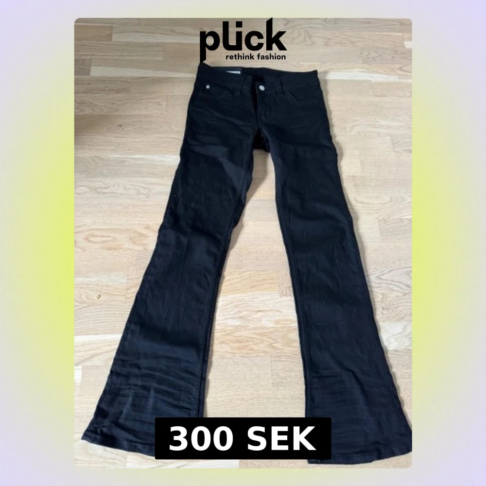Säljer ett par svarta bootcut jeans från Weekday i modellen Booby Bel Low Waist Skinny. Byxorna har låg midja, superstretch och klassisk femficksdesign. Passformen är slim upptill med utsvängda ben. Säljs då storleken var fel och hann inte skicka tillbaka