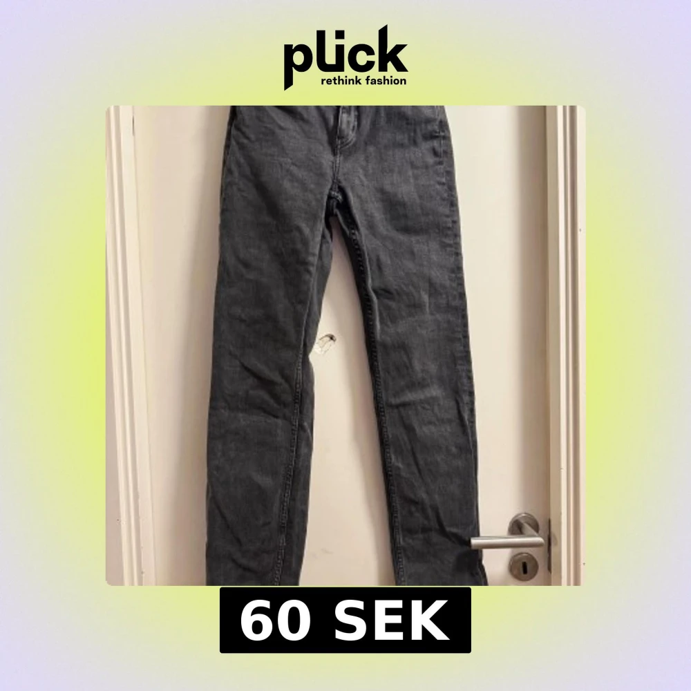 Säljer ett par svarta jeans med rak passform och klassisk femficksdesign. Jeansen har låg midja och är tillverkade i ett robust denimtyg. Perfekta för en stilren och enkel look.