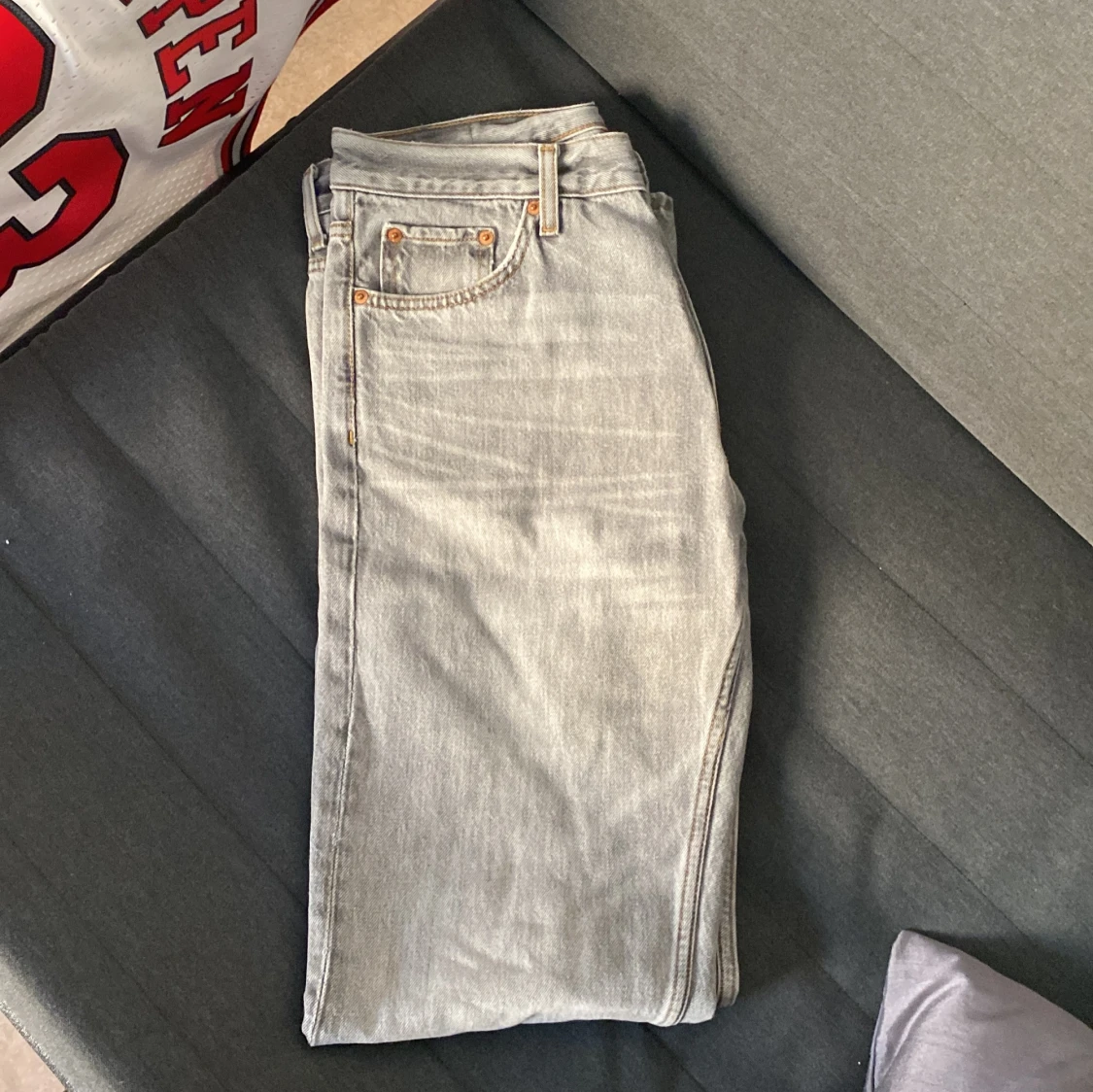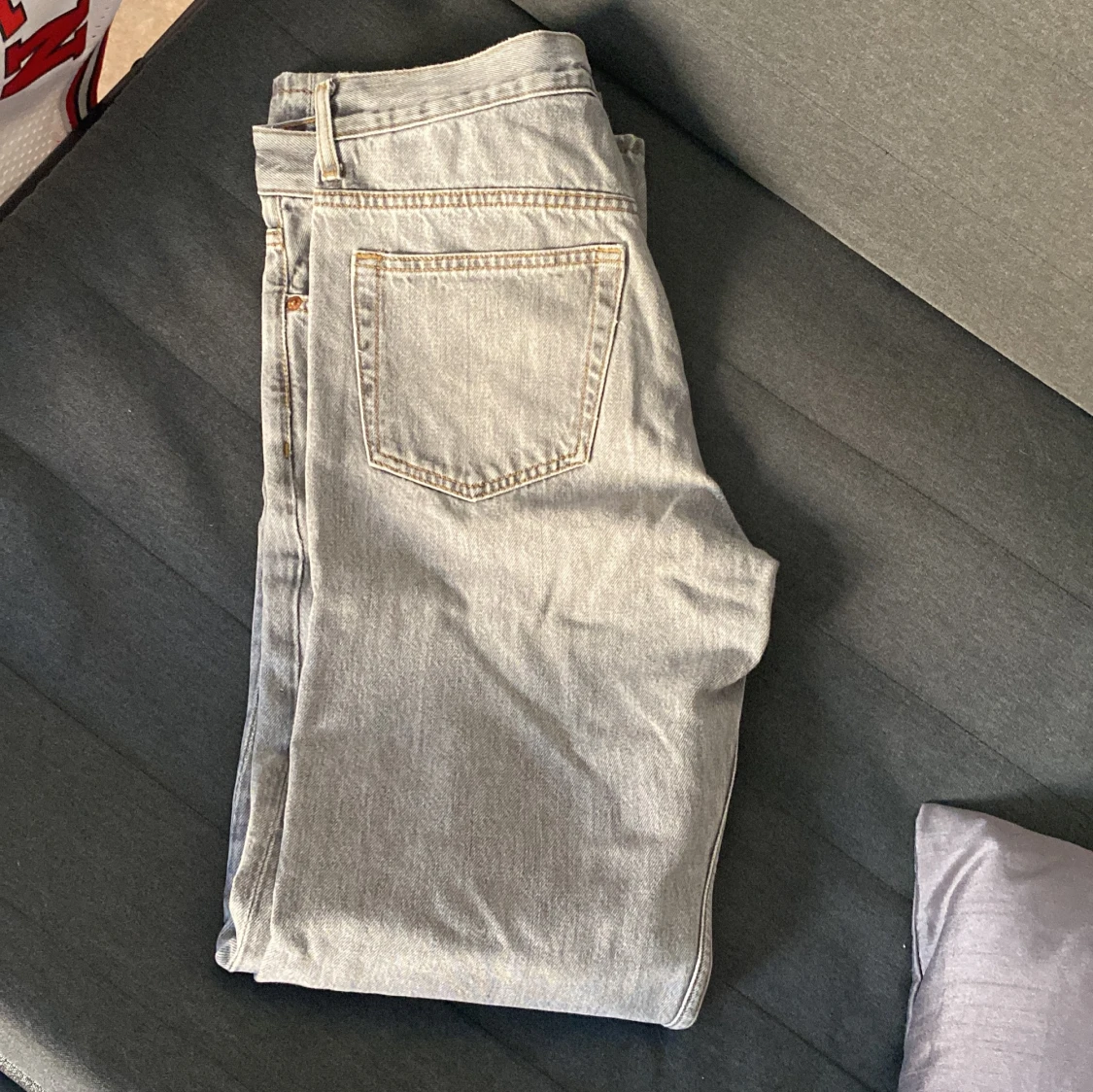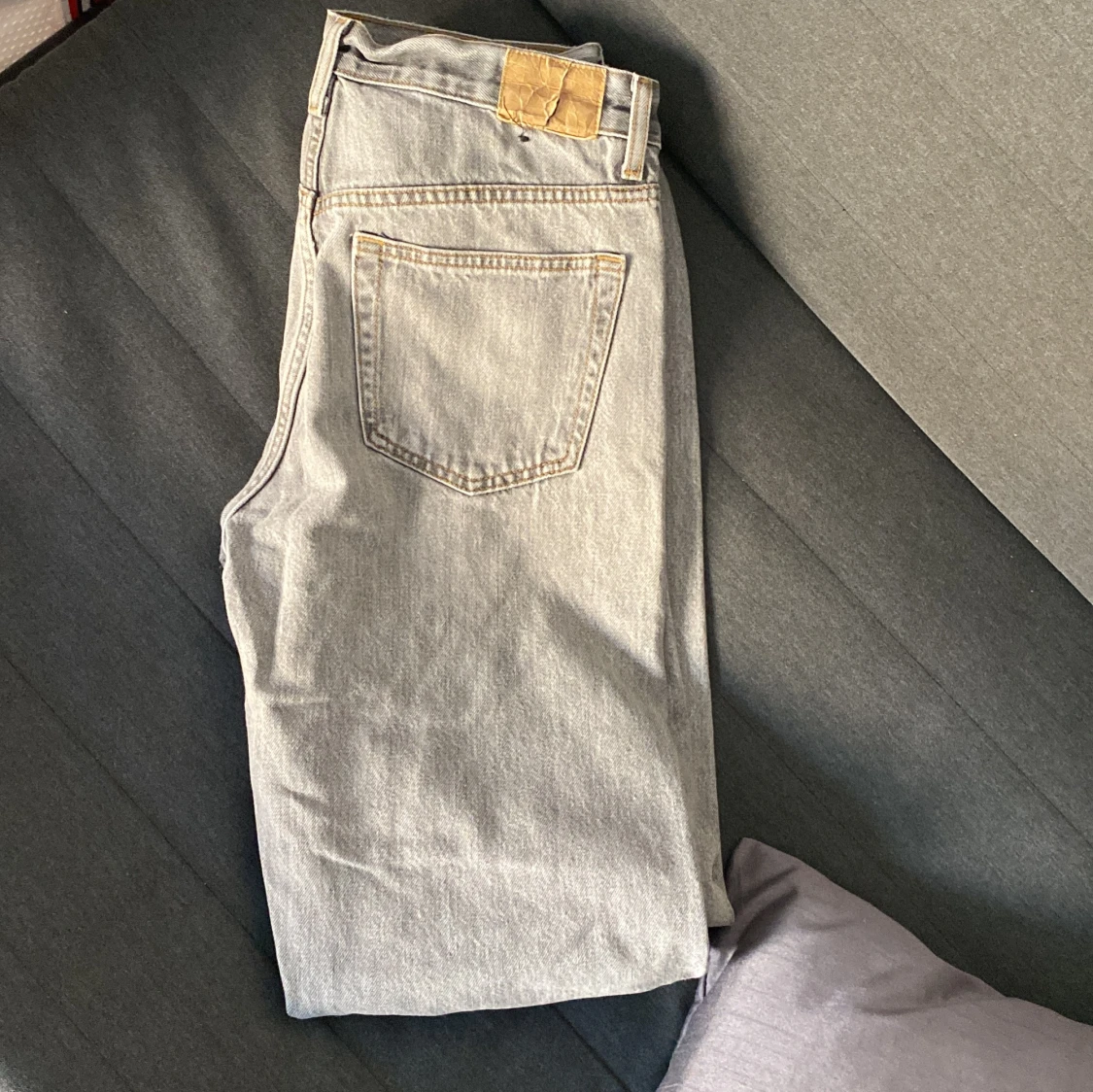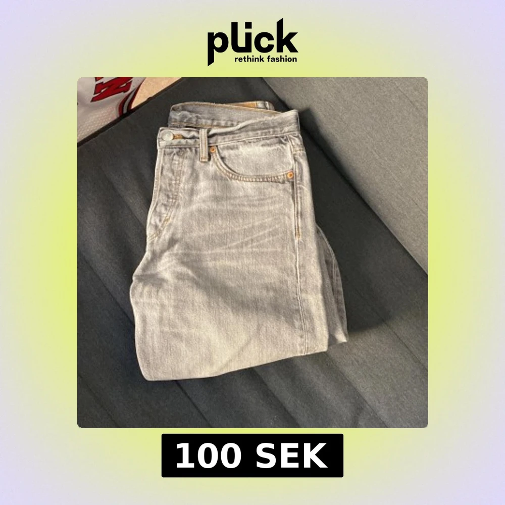 Säljer ett par ljusgråa Weekday jeans. Dem är lite slitna men bara på nästan omärkbara ställen. Dem är sköna och funkar till allt. Storlek, 29,34