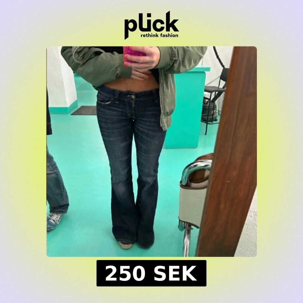 Säljer ett par mörkblå jeans med bootcut passform och låg midja. Jeansen har klassisk femficksdesign och stängs med dragkedja och knapp. Perfekta för dig som gillar en retroinspirerad look.
