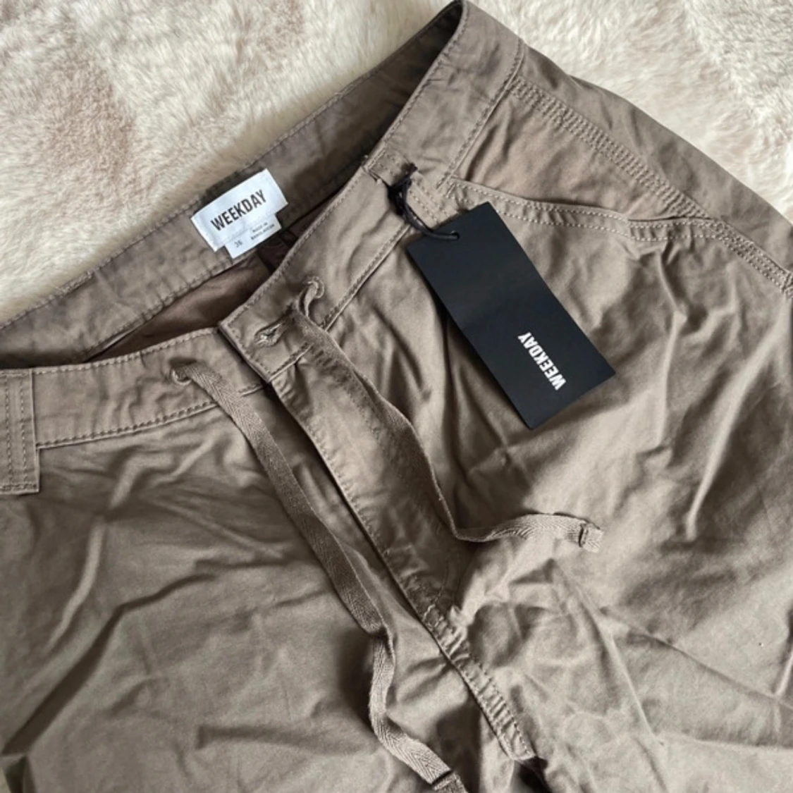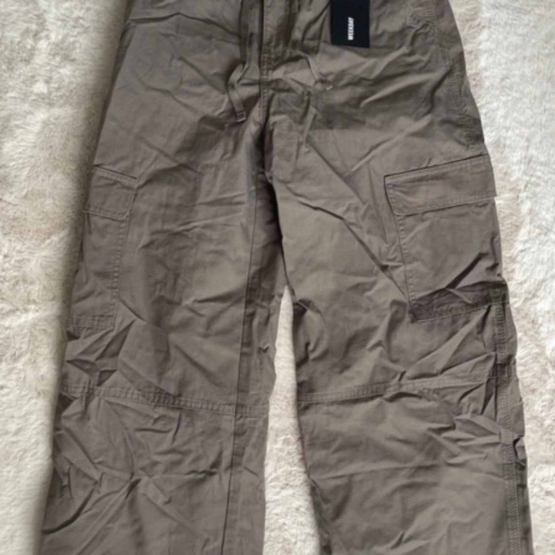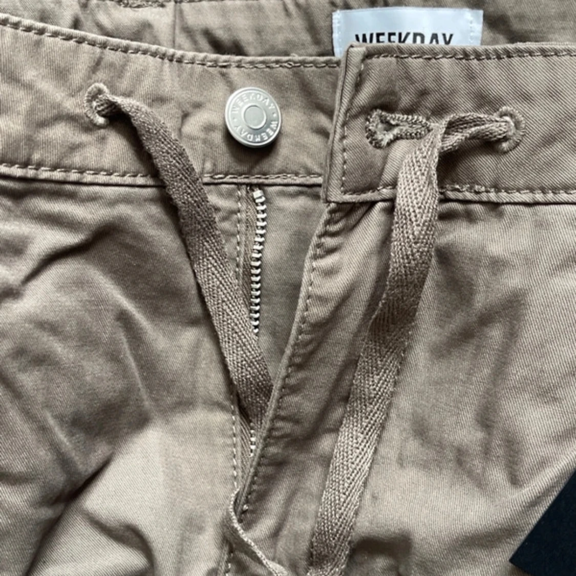 Snygga beige cargobyxor från Weekday med flera praktiska fickor. Byxorna har en avslappnad passform och är perfekta för en casual look. De har dragkedja och knapp framtill. Alldrig använda