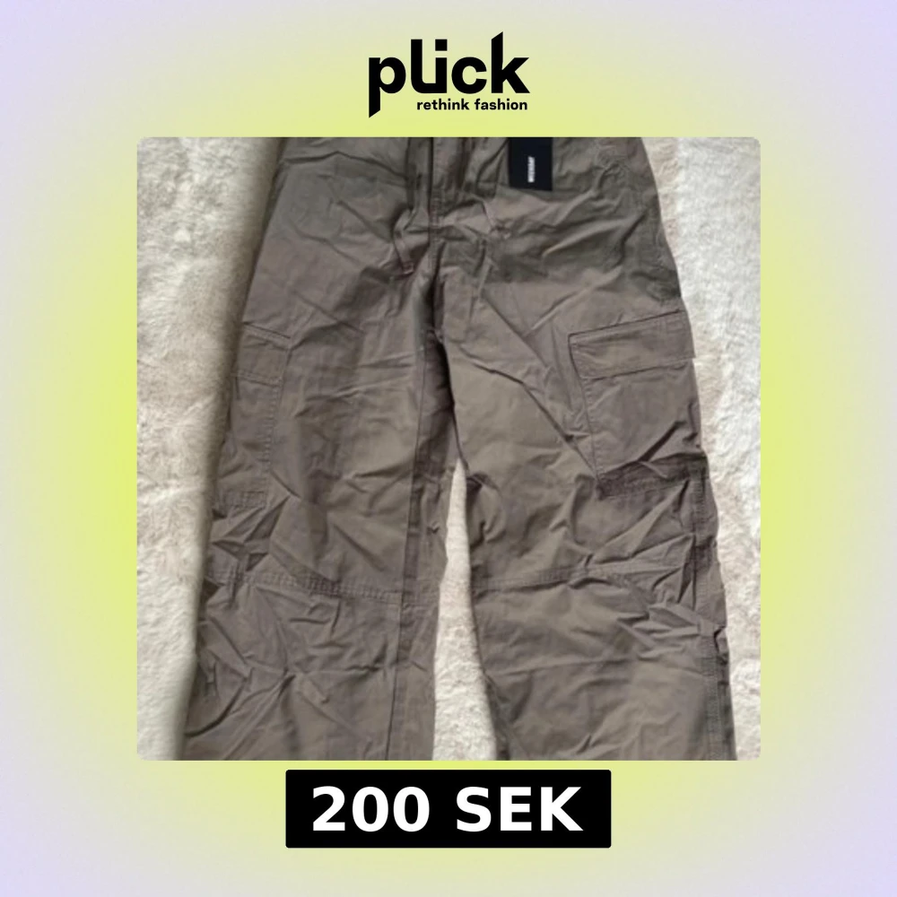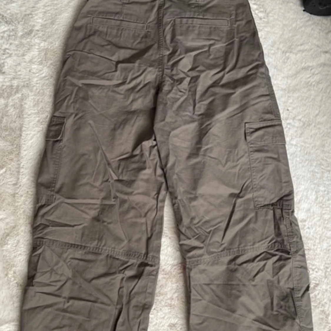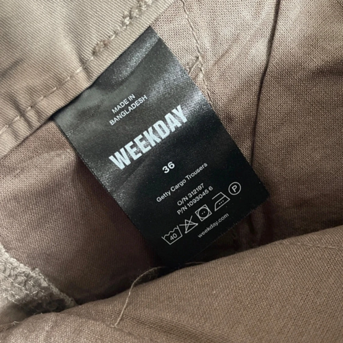 Snygga beige cargobyxor från Weekday med flera praktiska fickor. Byxorna har en avslappnad passform och är perfekta för en casual look. De har dragkedja och knapp framtill. Alldrig använda