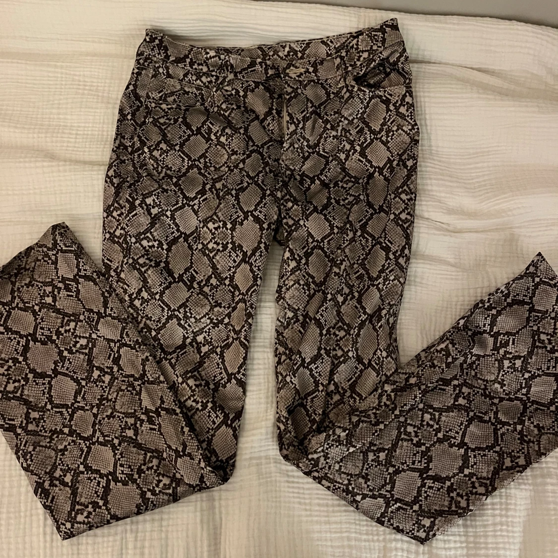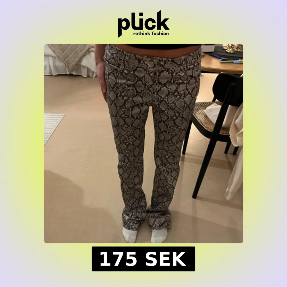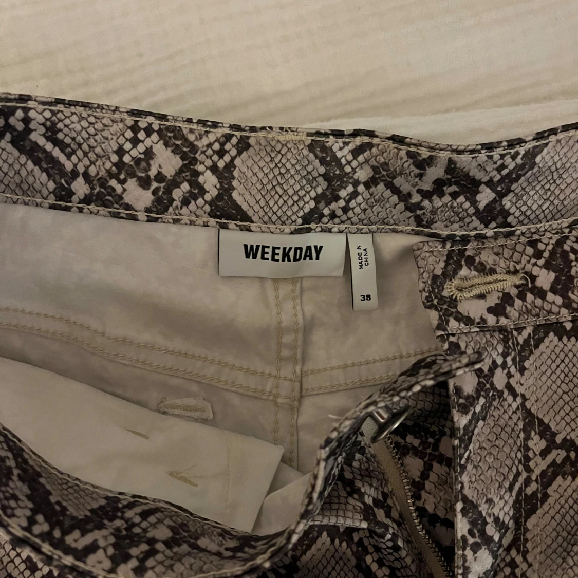 Snygga byxor från Weekday i storlek 38 med grått och svart ormmönster. Modellen är raka och har normal passform med klassisk midja. Har aldrig använt dem!