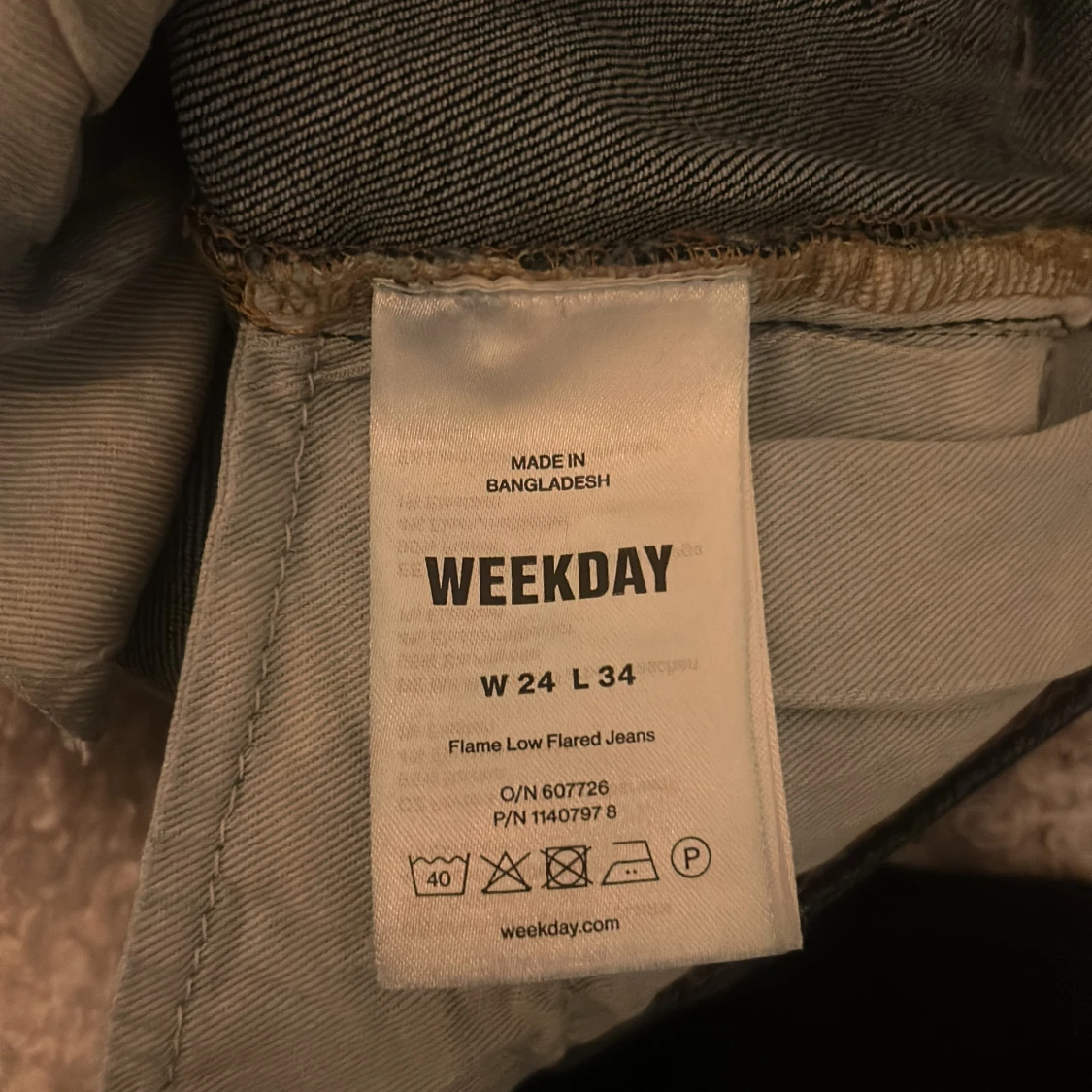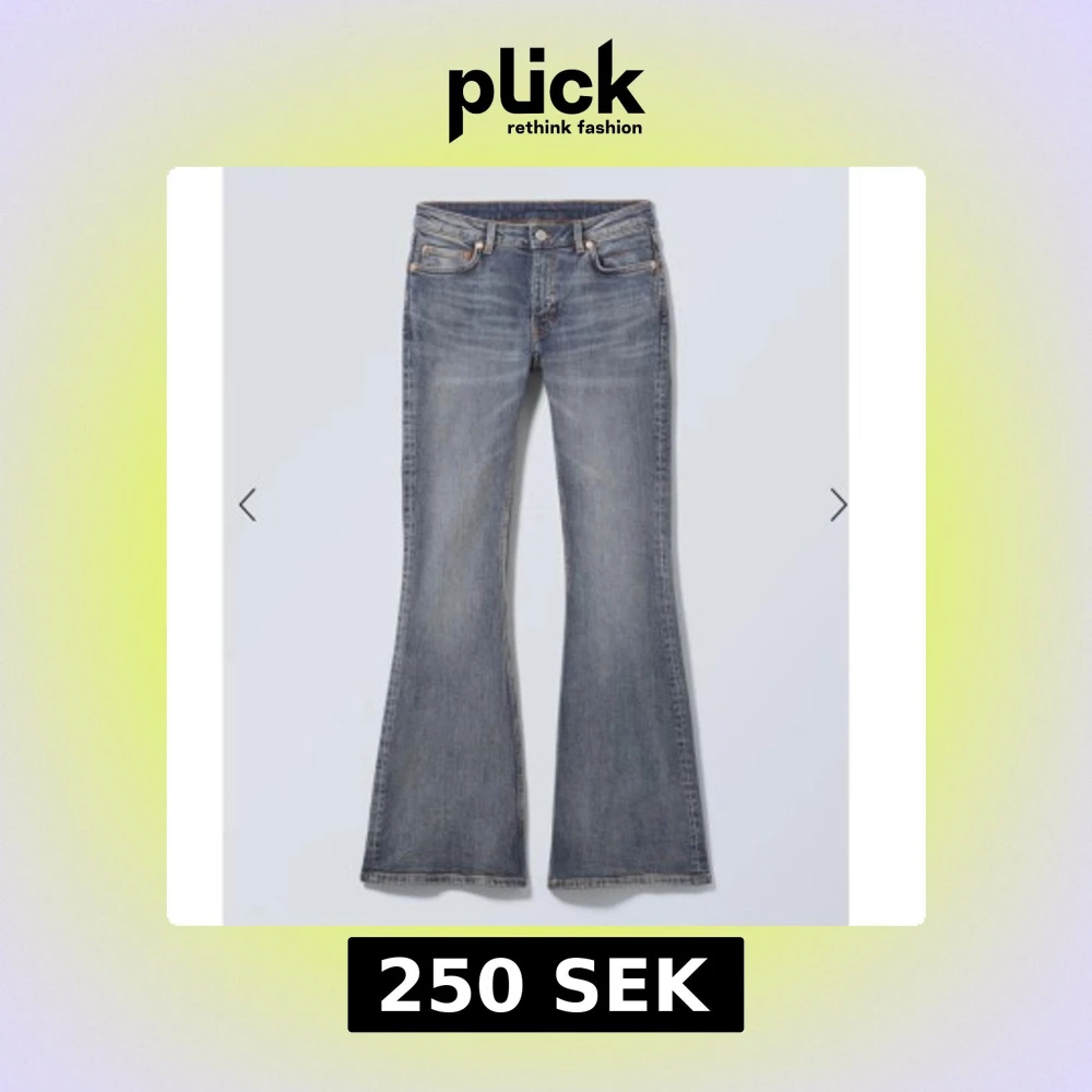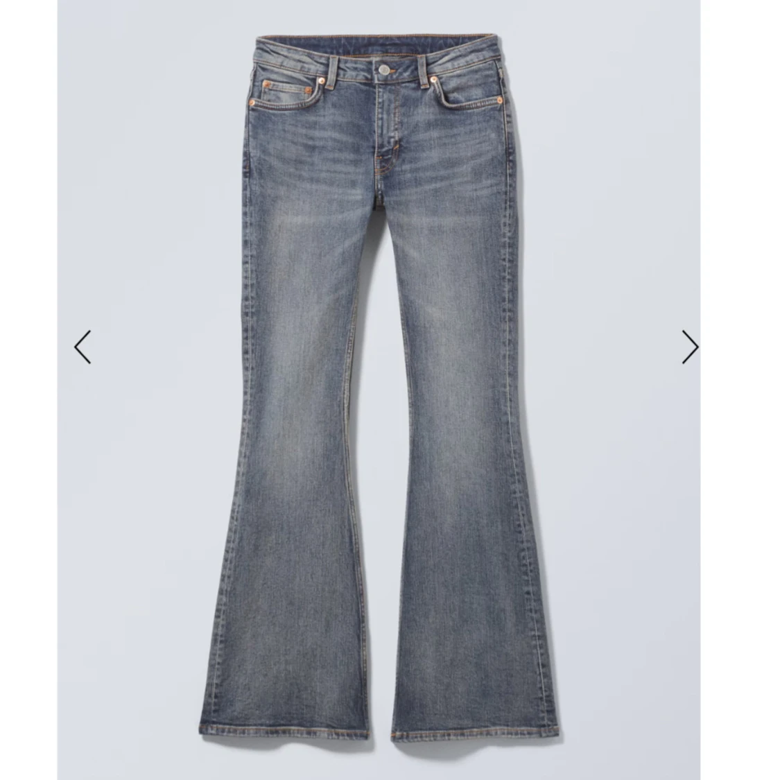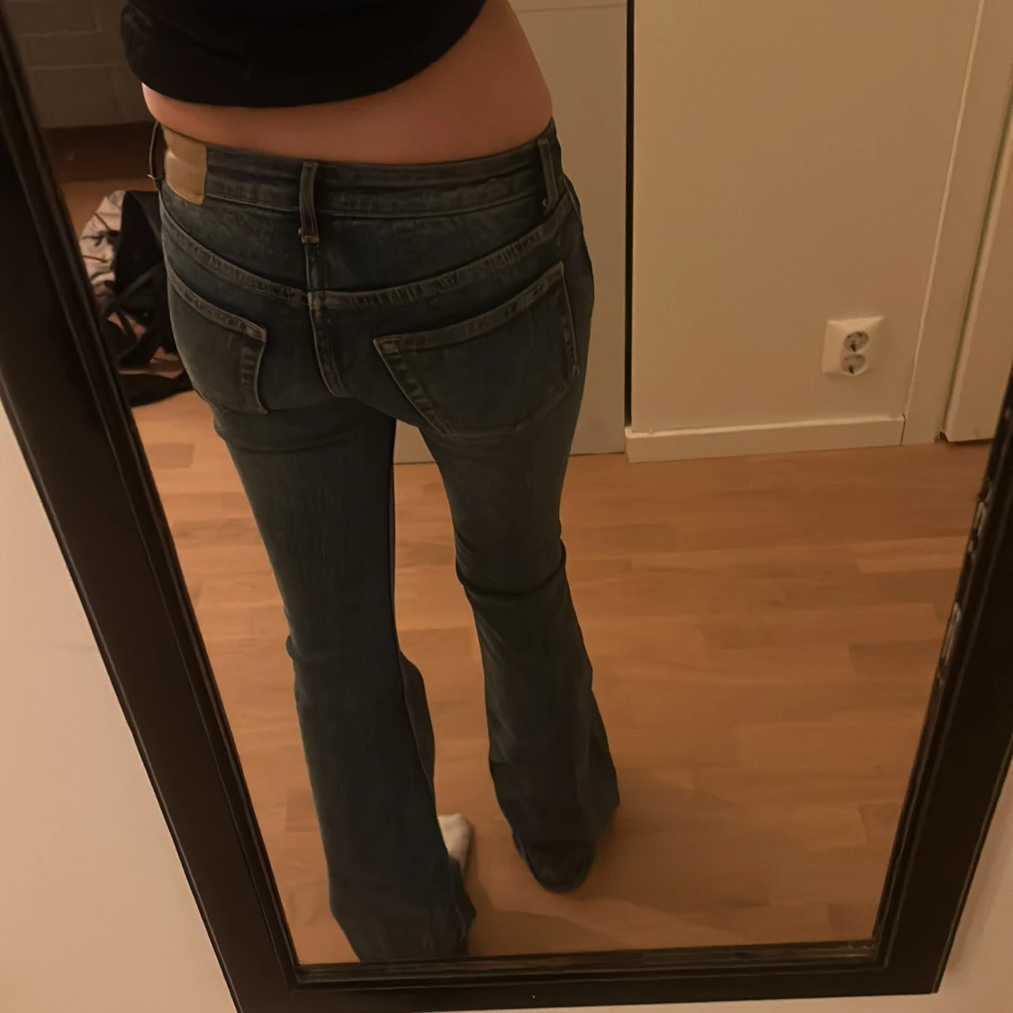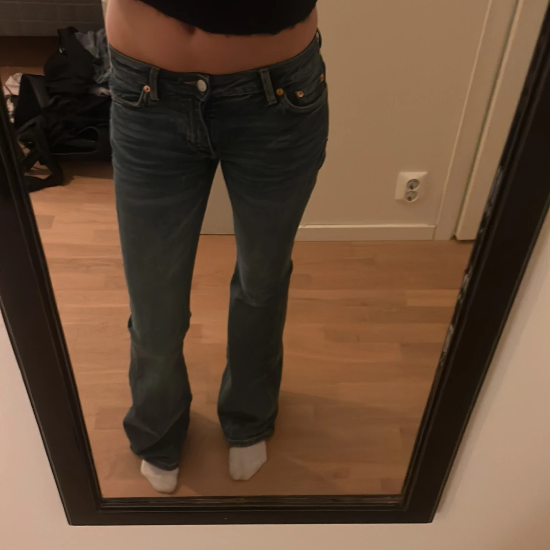 Säljer ett par blå Weekday Flame Low Flared Jeans, lågmidjade och bootcut💕 Storlek 24/34 Passar mig som är ca 169 cm😇 Skriv för mer detaljerade bilder! Köpta för 590 kr!