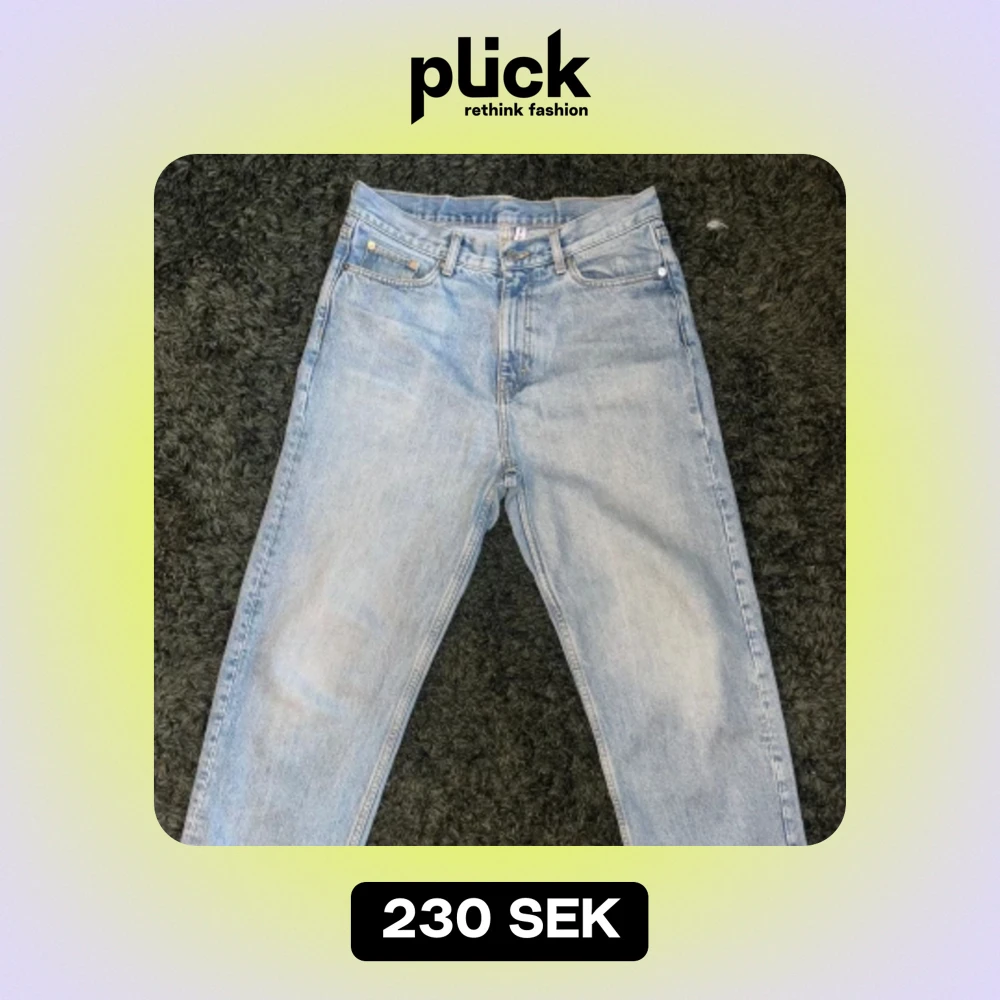 Jag säljer ett par blåa galaxy jeans från weekday. Dehär har lite rymligare passform, storlek 29/30. Jag är 184 cm. Fickorna hade förut hål men de är lagade nu så det är lugnt. Annars är de felfria bortsett från lite slitage pga användning.