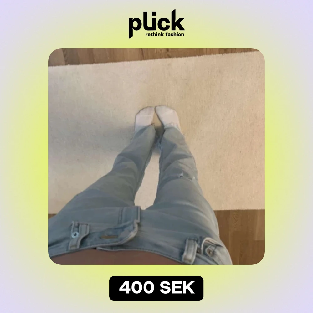 Säljer mina ljusblåa bootcut jeans med slitningar ifrån weekday! De är från början i storlek 24/32 men sydda till 30 i längden och passar perfekt på mig som är 158cm. 💝