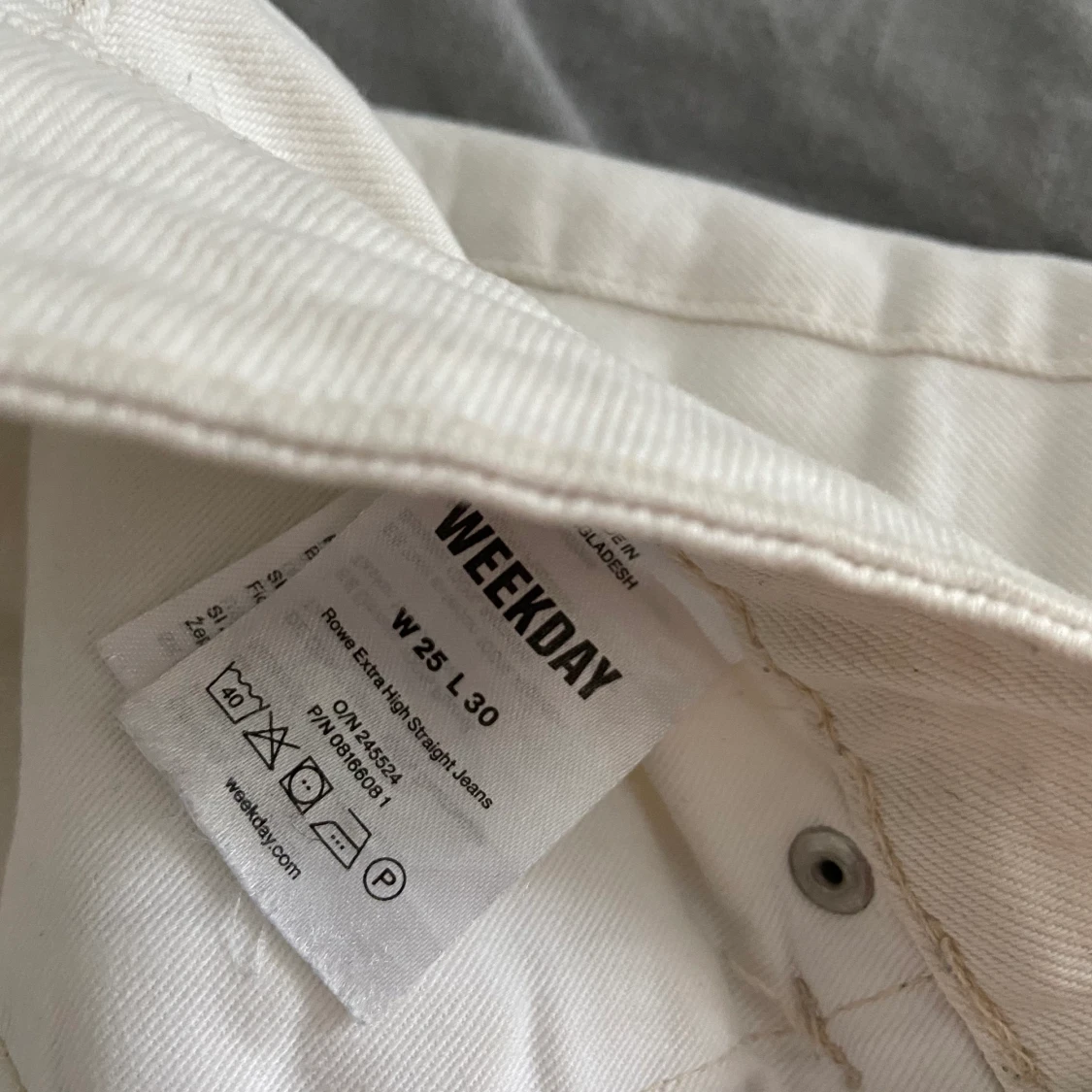 Jättefina jeans från Weekday som tyvärrr har blivit för små för mig. Dom är i bra skick men har lite fläckar längst ner (visas på bild 3). Storlek W25/L30. Frakt tillkommer:)
