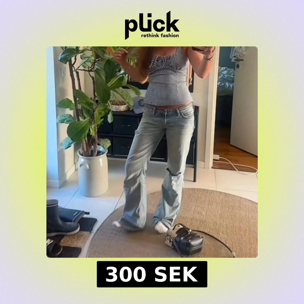 Säljer ett par ljusblå jeans med bootcut passform och låg midja. Jeansen har slitningar och hål vid knäna för en cool, avslappnad vibe. Materialet är klassisk denim och byxorna har fem fickor samt dragkedja och knapp framtill.