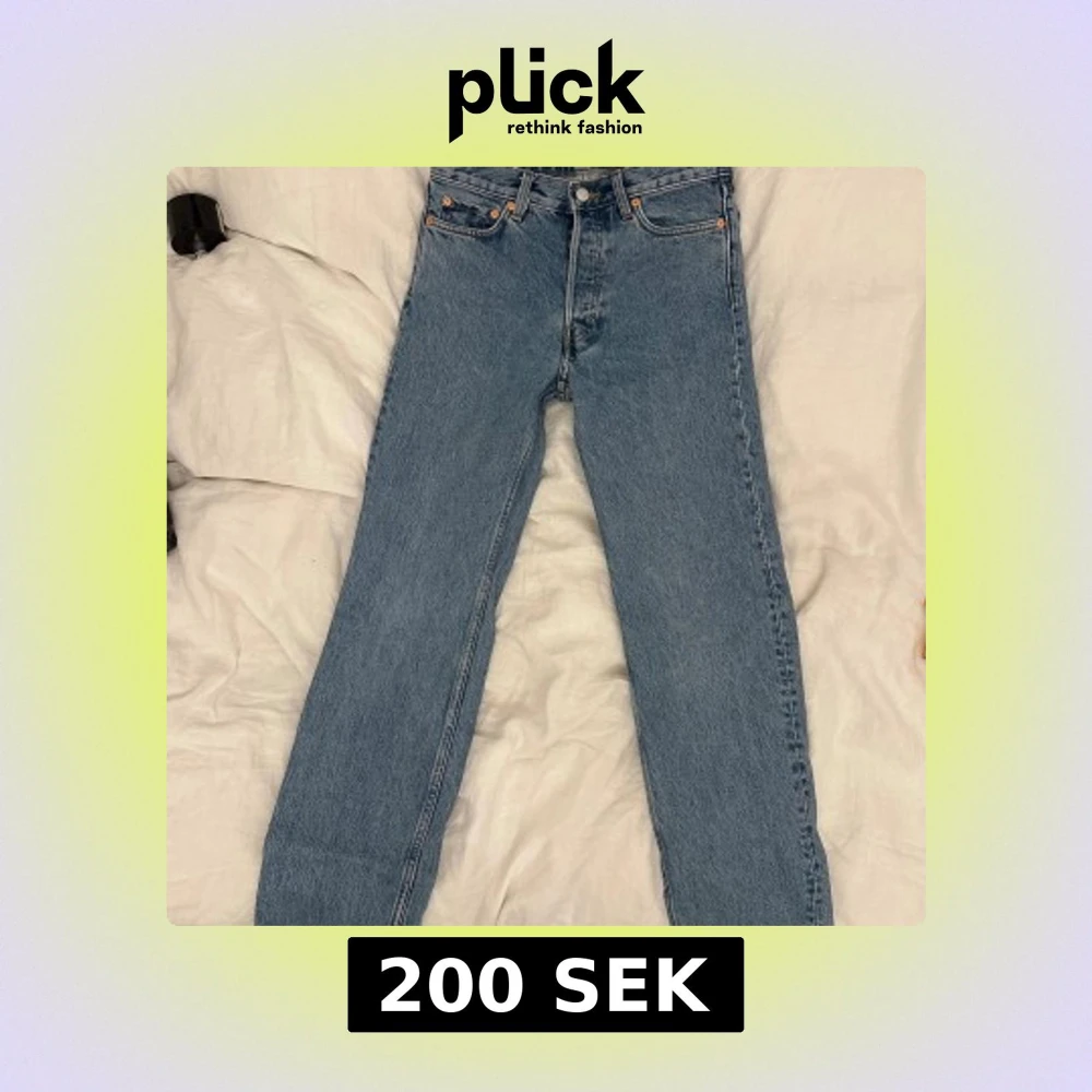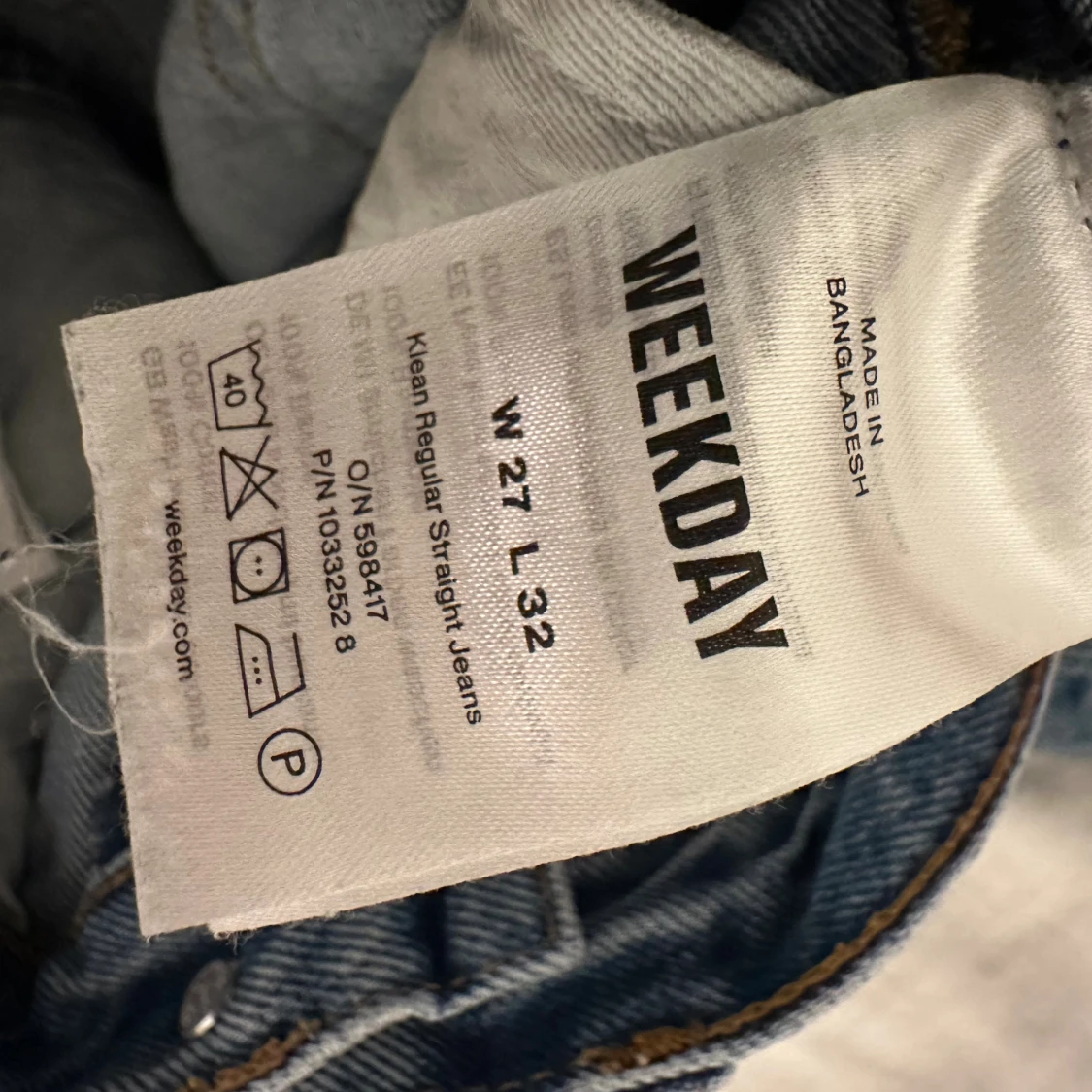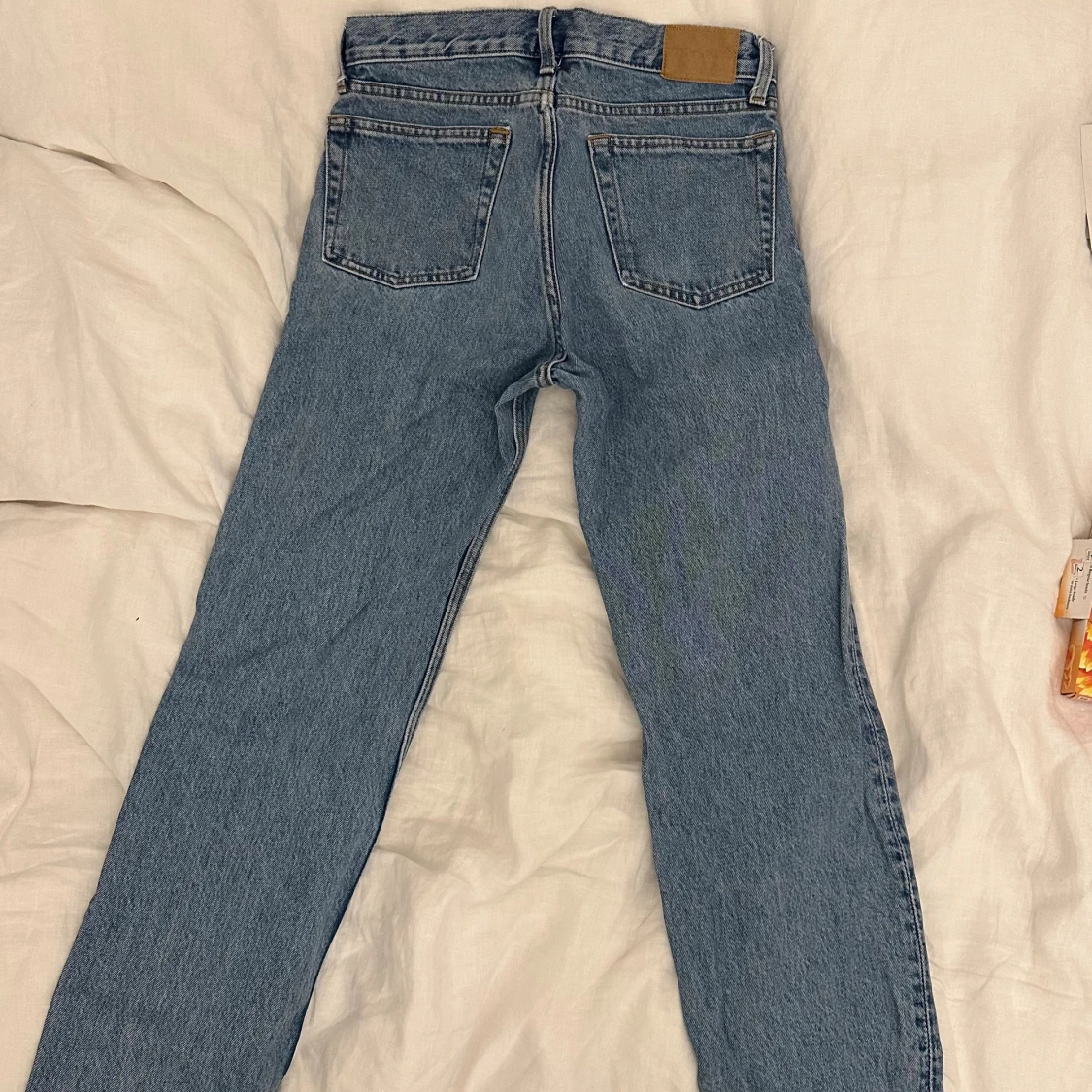 Säljer ett par klassiska blå Weekday Klean Regular Straight Jeans med raka ben och normal passform. Jeansen är tillverkade i bomull med en snygg ljus tvätt. Perfekta för en clean och stilren look.