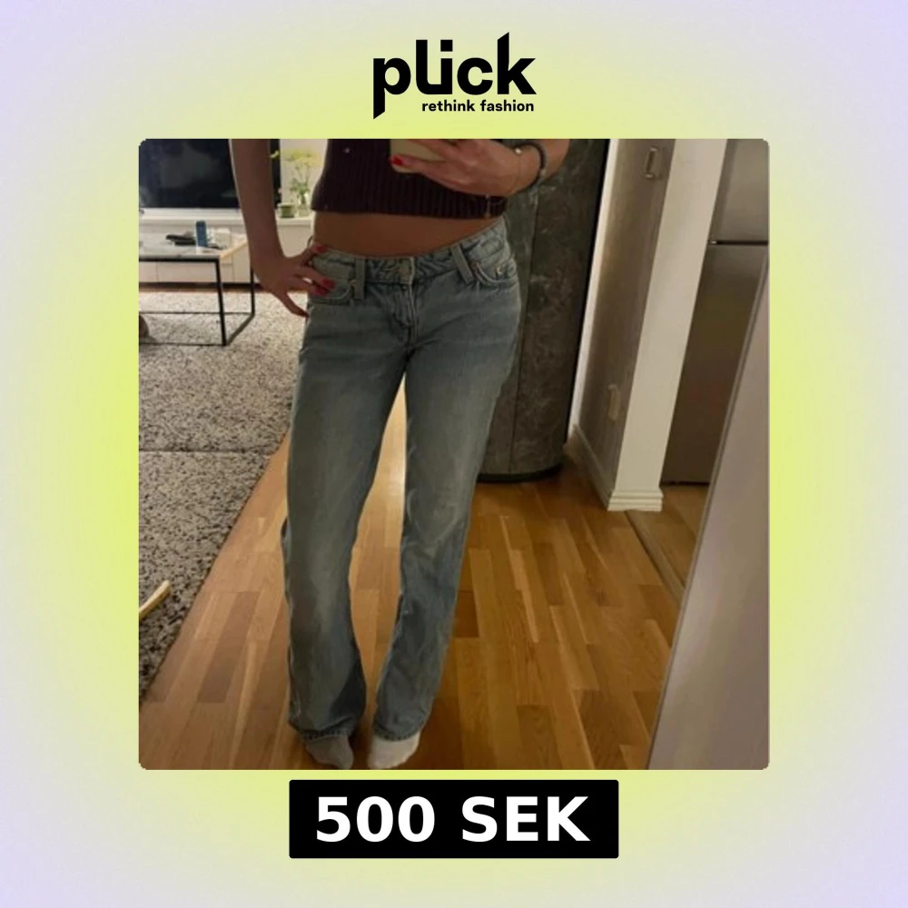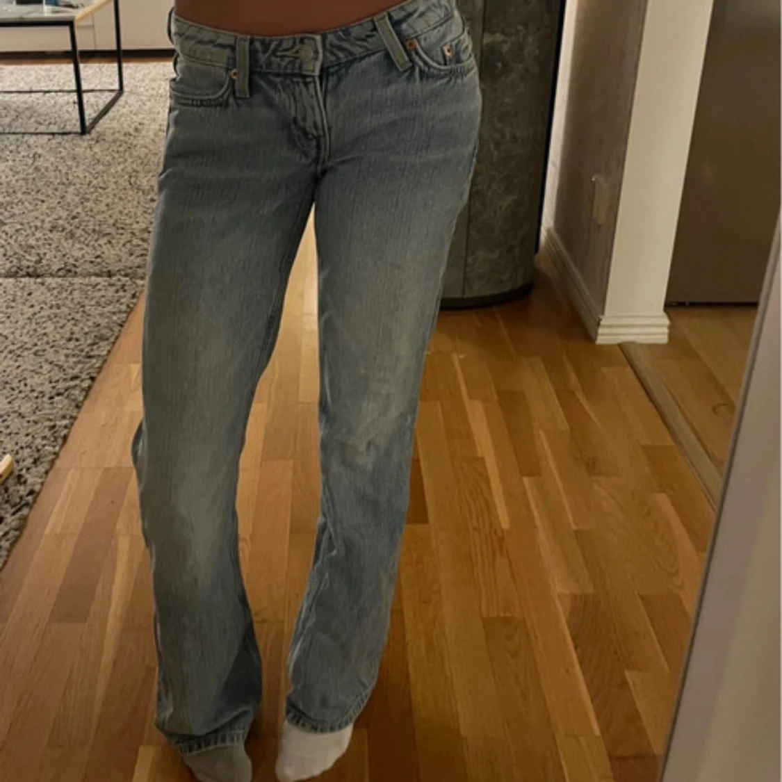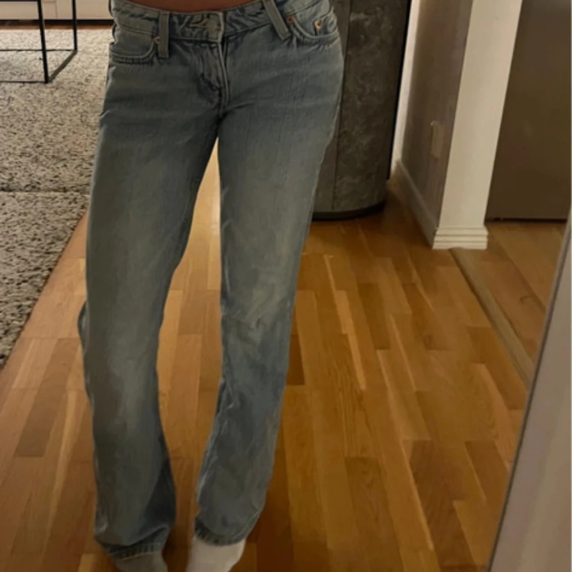 Säljer ett par jeans i ljusblå tvätt med låg midja. Jeansen har raka ben och normal passform, tillverkade i mjukt denim. Perfekta för dig som gillar en avslappnad och tidlös look.