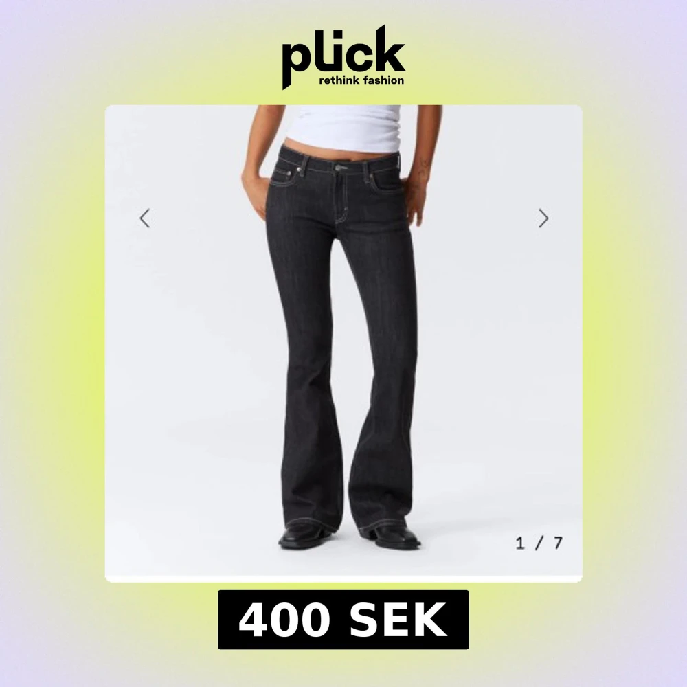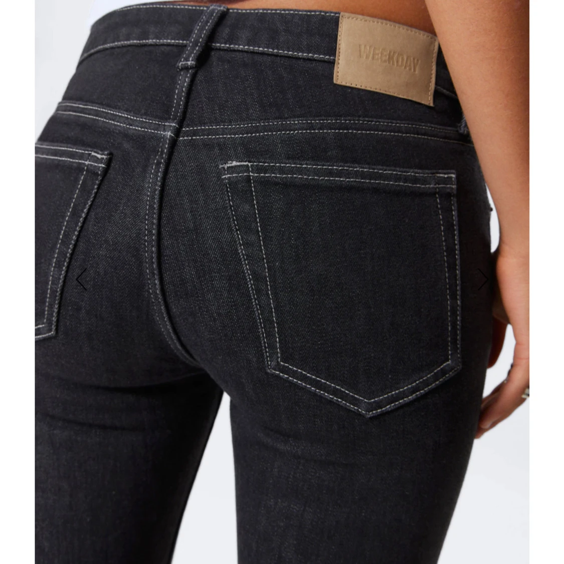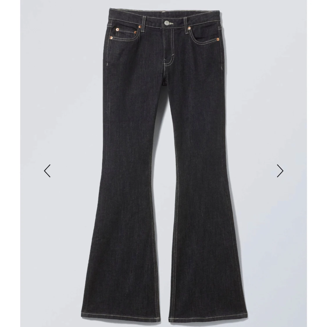 Snygga svarta jeans från Weekday med bootcut passform, vit sömn och låg midja. De är endast använda fåtal gånger utan några defekter, ser helt nya ut. Nypris är 590kr. Storlek W 29 L 34. Skriv gärna vid frågor 💖