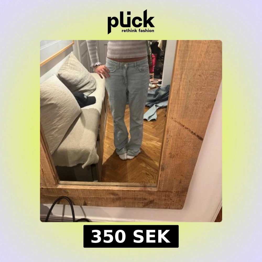 Säljer ett par ljusblå jeans med rak passform och klassisk femficksdesign. Jeansen har hög midja och stängs med dragkedja och knapp. Perfekta för en avslappnad och stilren look.