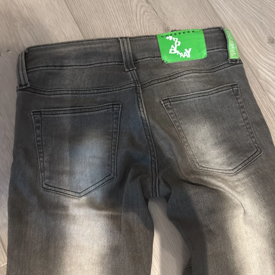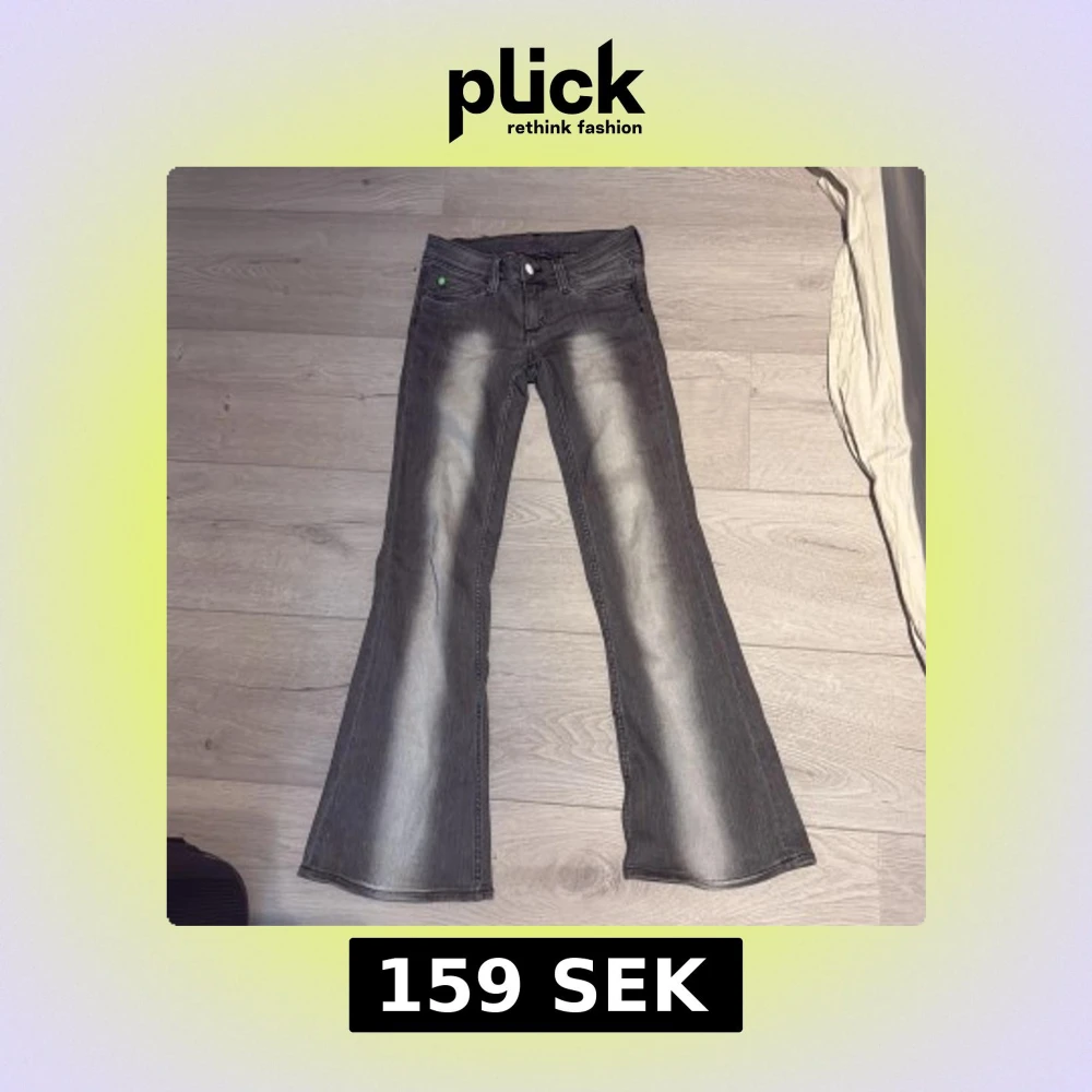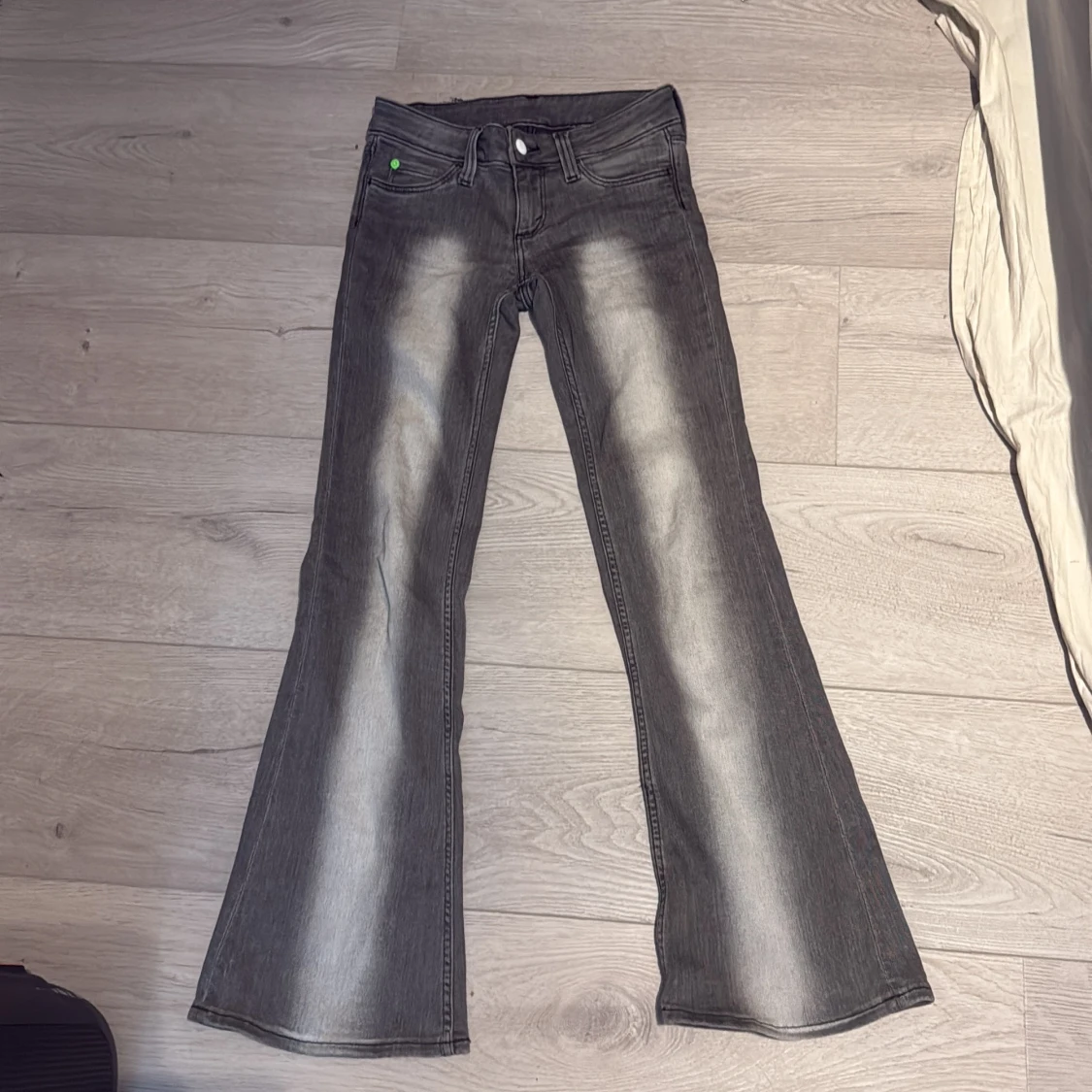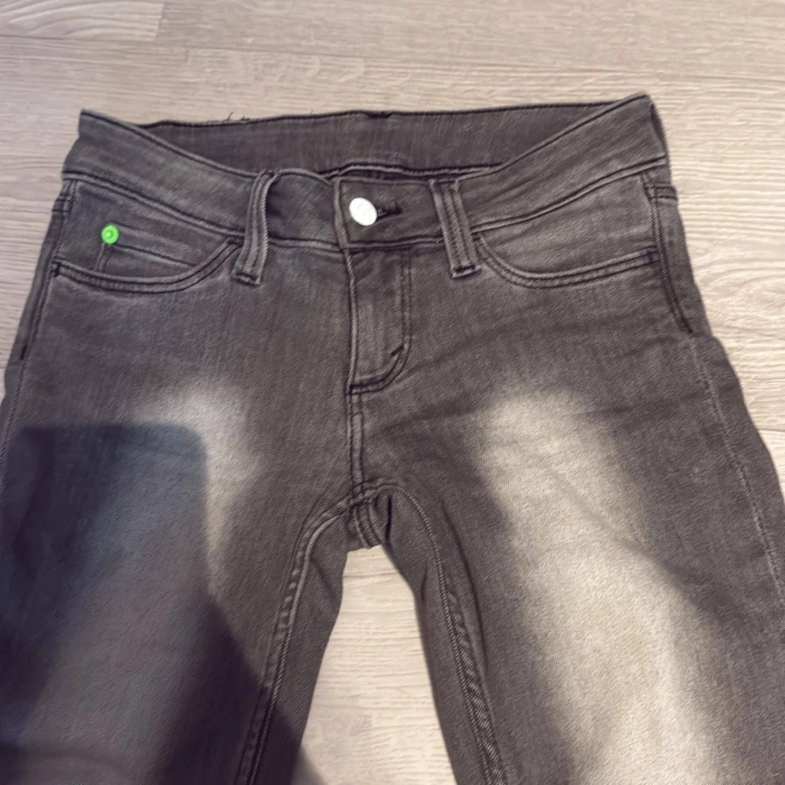 Snygga grå jeans från weekday med bootcut passform och coola slitningar framtill. De har klassiska fem fickor, gröna detaljer på knapp och bakre etikett, samt dragkedja. Perfekta för dig som gillar en retro vibe och vill sticka ut lite extra. Dom har ju lite konstiga storlekar på weekday så minns inte vilken jag har, men jag är en 167 lång och dom passar mig så skulle säga 2 då
