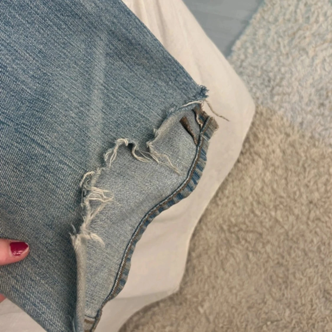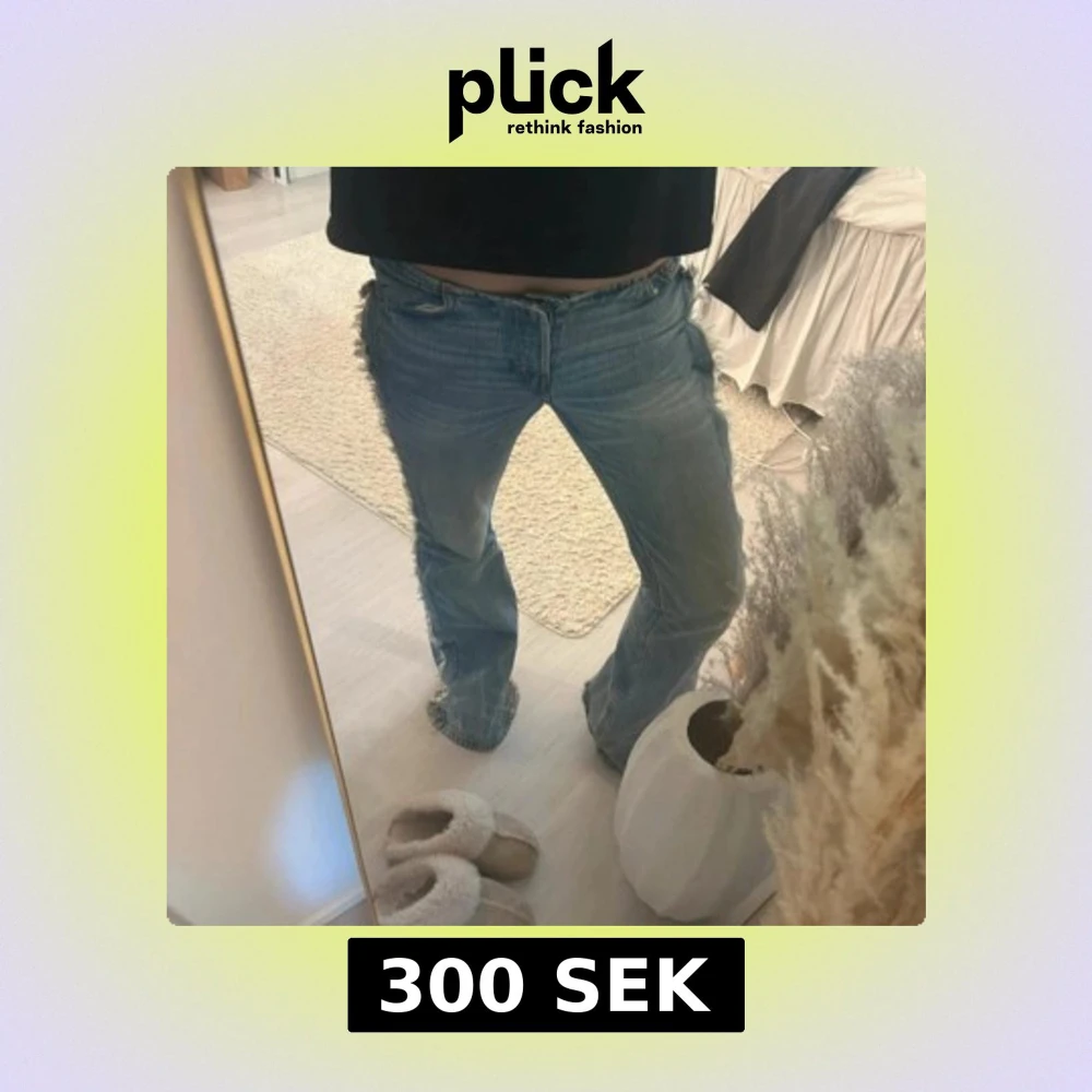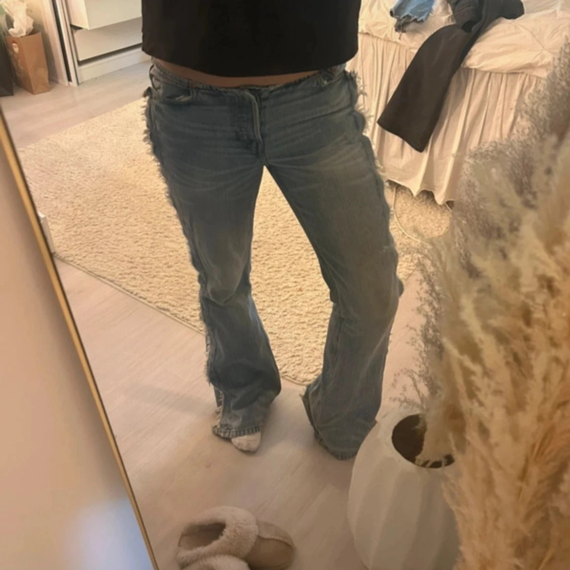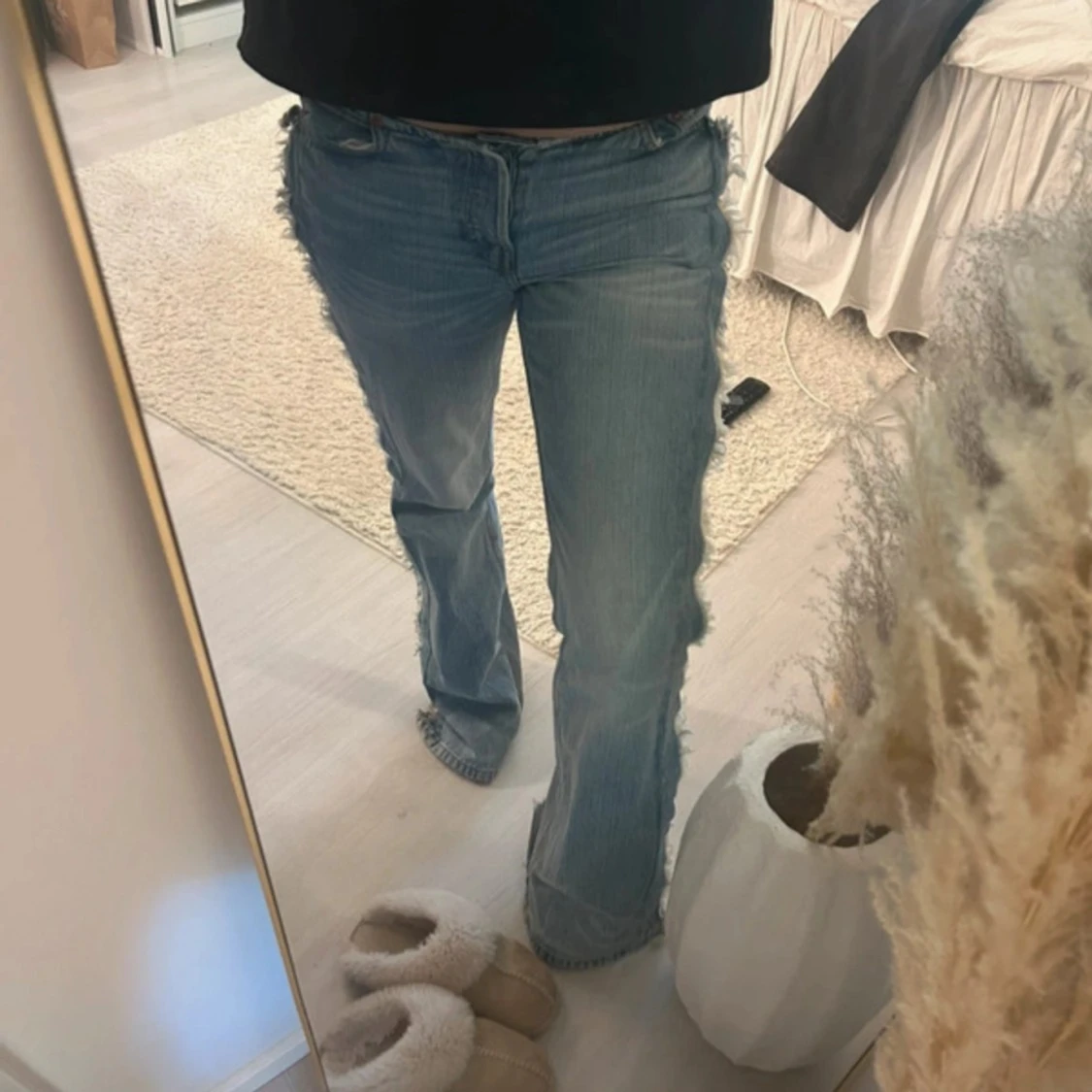 Supersnygga blåa jeans med fransar på sidorna!! Slitna på baksidan se sista bild, är för långa för mig som är 160, passar betydligt längre 😊
