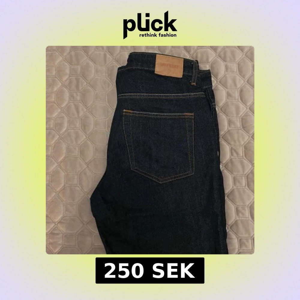 Snygga mörkblå jeans från Weekday med klassisk femficksdesign och raka ben. Jeansen har kontrastsömmar och en läderpatch med logga bak i midjan. Perfekta till vardags och lätta att styla med olika outfits. Säljer då dom är förstora och endast används fåtal gånger, model pin stl w28 l32