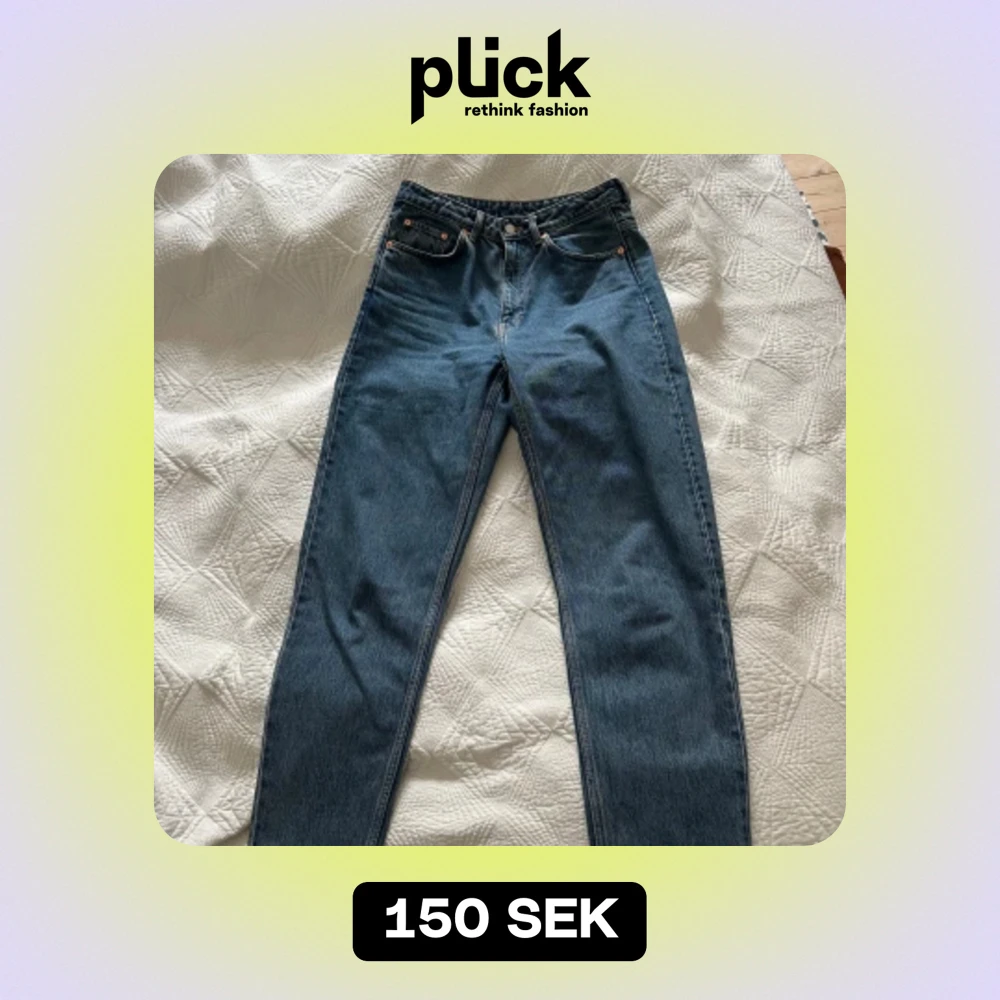 Superfina mellanblå jeans från Weekday modell Lash Extra High Mom Jeans. 100% bomull, jeansen som nya, använt fåtal ggr, strl passar ej mig i strl så säljer.