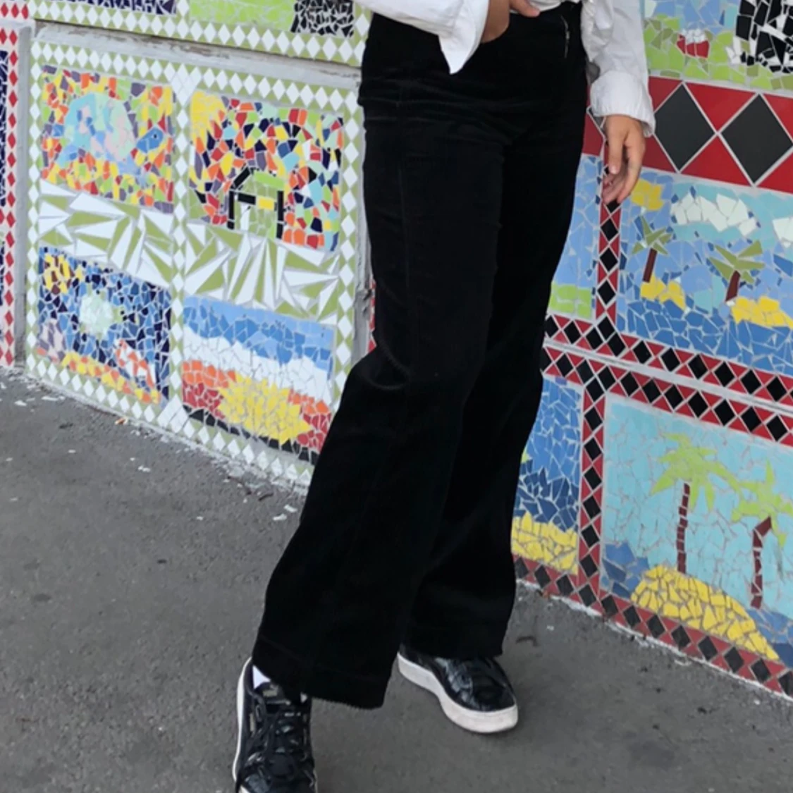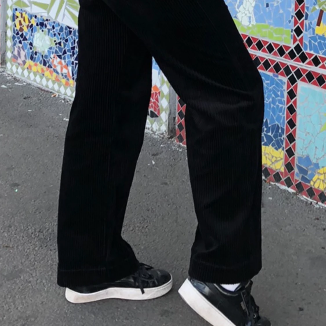 svarta Manchester byxor (materialet syns ej på bilden) från weekday. Använda några gånger. De är vida och sitter super bra! Frakt tillkommer. Priset står längre ner i posten. Nypris: 500kr. Kan gå ner i pris